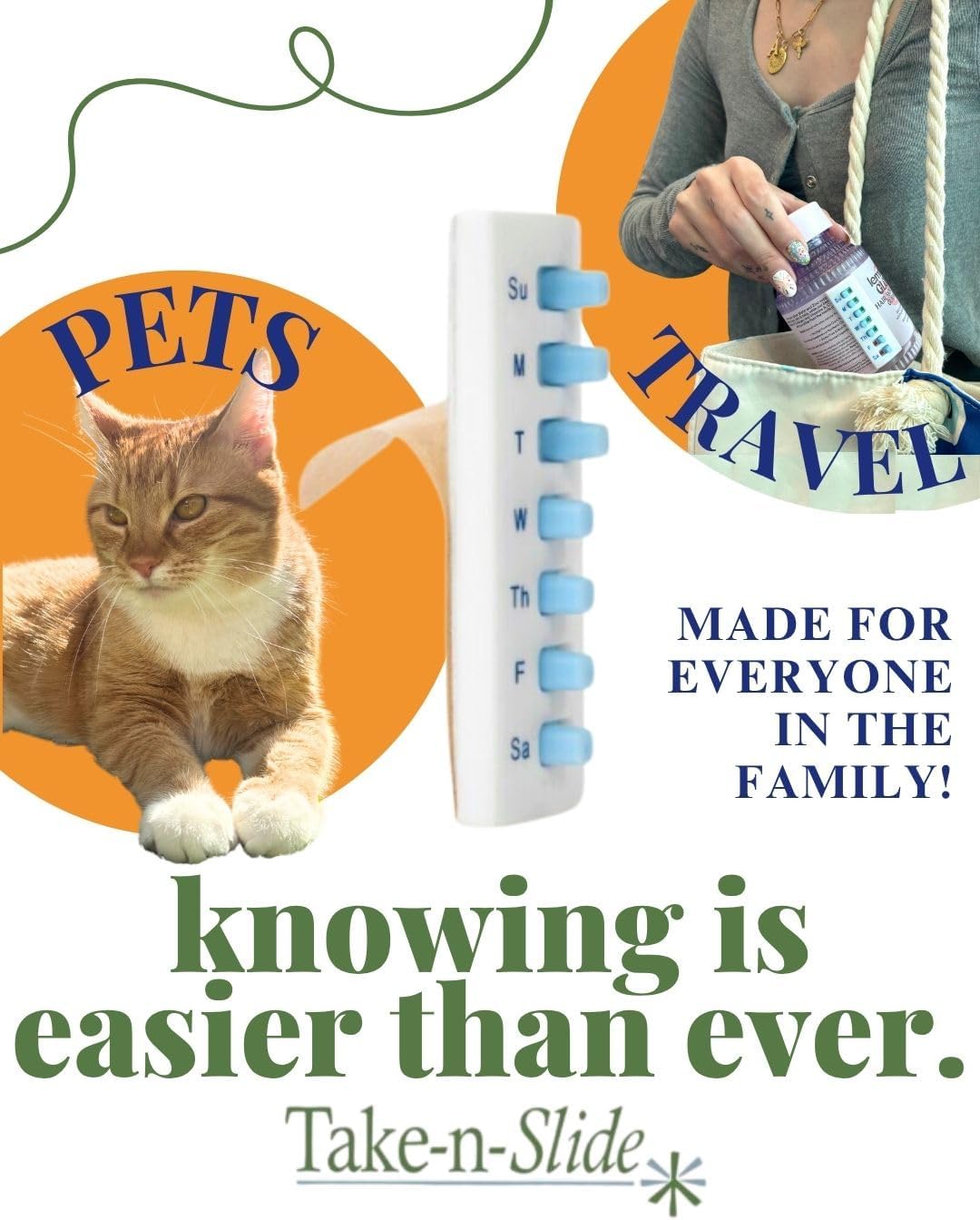 Are you tired of struggling to remember if you have taken your daily medications? Say goodbye to missed doses and confusion with Take-n-Slide, the ingenious daily medication dosage tracker that attaches directly to your medication bottles. Simple: Take-n-Slide is a simple yet highly effective tool that helps you stay on top of your medication schedule. The user-friendly design lets you keep track of your single or multi-dose medications. Reusable: Not only is Take-n-Slide reusable, but it also allows you to attach additional sliders to the bottle, accommodating more than one dose. This makes it perfect for managing complex medication regimens. Forget No More: Users are thrilled with how Take-n-Slide has transformed their medication routines. Confidently remember to take your pills as prescribed. Great for Inhalers Too: It’s not just for traditional medication bottles; it also works wonders for inhalers, making it an ideal companion for your respiratory treatments. Aging-friendly: Take-n-Slide is a game-changer for seniors or individuals with aging parents who may have trouble remembering their medication schedule. No more cumbersome pill organizers, just simplicity at its finest. Reusable: The sliders stick securely to all types of bottles, ensuring they will not fall off, even during travel or everyday use. Plus, they are easily reusable, reducing waste and environmental impact. User and Doctor Recommended: Customers have hailed Take-n-Slide as a dream come true for forgetful folks. Doctors also endorse its effectiveness in helping patients stay compliant with their prescribed medications. Bid farewell to the hassle of pill organizers and the fear of double dosing. It is time to take control of your medication routine and enjoy peace of mind knowing you'll never again ask yourself, "Did I take my meds today?"