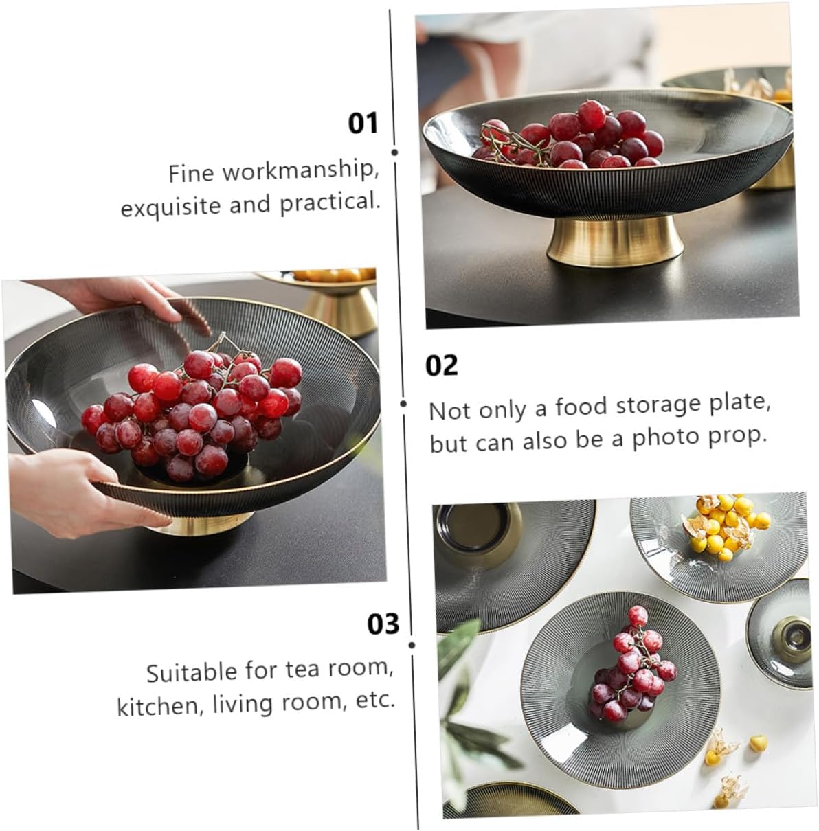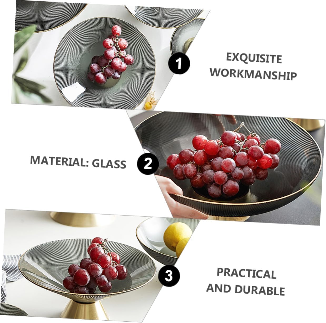 Package Include 1 x Fruit Tray Features - Color: Grey -Material: Glass. - Size: 24.50X24.50X11.50cm/9.63X9.63X4.52in -Product Info:Glass fruit tray - Suitable for displaying cupcakes, desserts, biscuits, dried fruits, candies, pastries and snacks fruit pattern glass fruit bowl. - Fashion sense, elegant appearance, craftsmanship and delicate details glass fruit tray - The bottom base is stable, so there is no need to worry about food falling off Tall Fruit Tray - The elegant and design is suitable for most home decorations fruit decorative bowl - Suitable food display plate for home, restaurant, tea room, hotel, hotpot restaurant, etc glass footed bowlGoods Descriptiondecor is made of material, strong and , not easy to break and damage.large pedestal can make your fruit or dessert look more attractive and can be used for banquets, birthday parties, weddings and other occasions.Dried Fruit Tray Do you want to show your delicious desserts in a creative way? Please take at our tall glass display plate