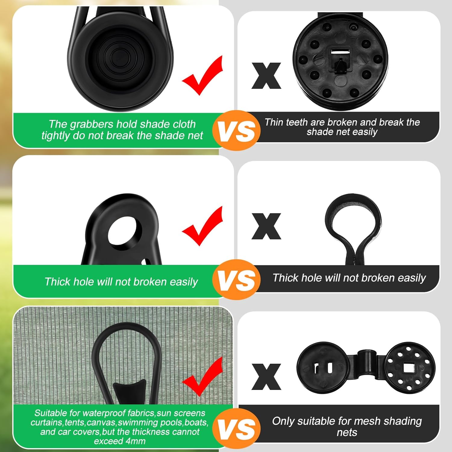 Features: Practical gifts: You can send the heavy duty shade cloth clips to your friends, neighbors, family members and coworkers, which can show your warm heart and kindness, the person who receives these gifts will be happy. Effective functions: The round shade fabric clips effectively hold the sun shade netting in place to protect plants from birds, creating a cool and quiet environment for your garden. Specifications: Material: plastic Color: black Size: as picture show Package includes: 200 x Shade cloth plastic clips Notes: Manual measurement, please allow slight errors on size. The color may exist slight difference due to different screen displays.
