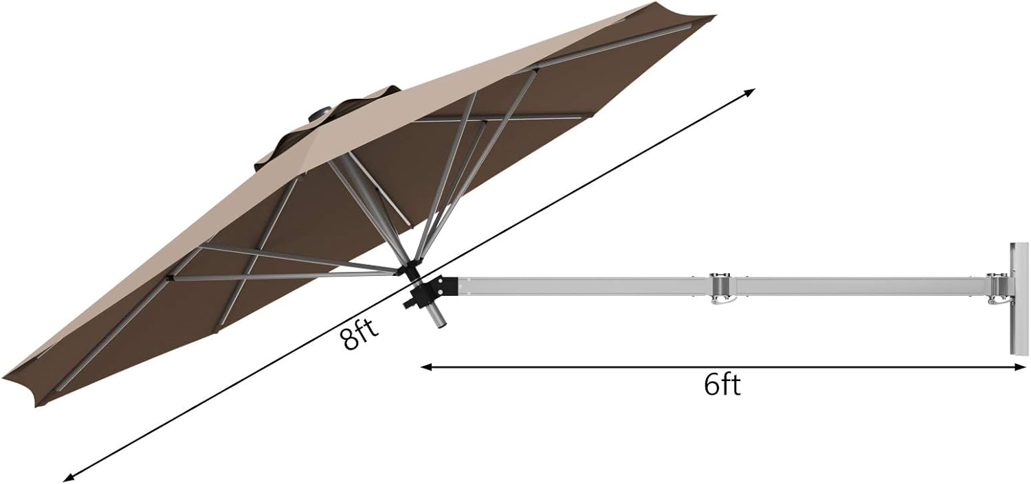 DescriptionOur wall-mounted umbrella brings you a wonderful outdoor leisure time!It is made of heavy-duty aluminum frame and 8 heavy-duty ribs, which are more durable and sturdier to use longer. Durable polyester canopy provides more shade area and it’s fade-resistant, water-proof and sun-protection to be perfectly used outdoor. The special wall-mounted design gives it a compact and space-saving size for greatly save the space outdoor. You can adjust the angle of the umbrella head to block the sunlight in desired angle and control the position of the pole for your different needs. A zipper and wind vent add more convenience for using.FeatureIt provides large shade space and allows more people to useHeavy-duty aluminum frame is more durable and sturdierWidely used in garden, balcony, deck, pool or coffee placeWater-proof and fade-resistant polyester canopy last longerA wind vent keeps maximum air flowEffectively block the harmful sunlightWall-mounted design can save your space wellVarious angle and position adjustments to get the best shading area Come with a zipper for easier closing the umbrellaSpecificationColor: Beige, Red, Turquoise, TanMaterial: Aluminum, 240G PolyesterOverall Dimension: 8 ft (Dia) x 6 ft (L)Net Weight: 17 lbsPackage includes:1 x Wall Umbrella1 x Instruction ManualWhy you choose our Wall Umbrella?√Unique wall-mounted design for saving more space√Effectively block the sunlight with its large shade area