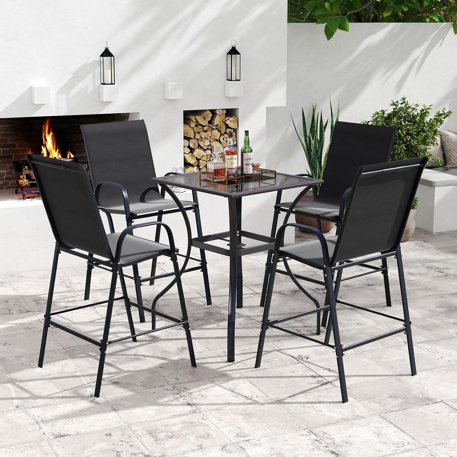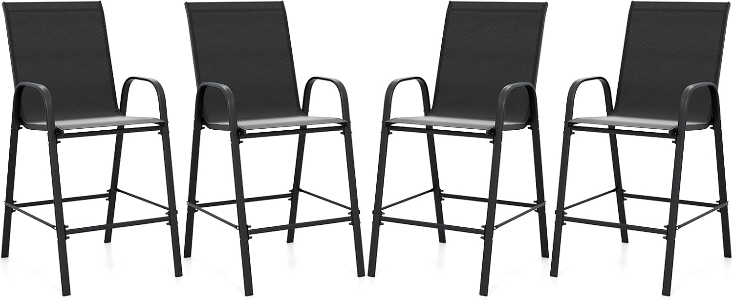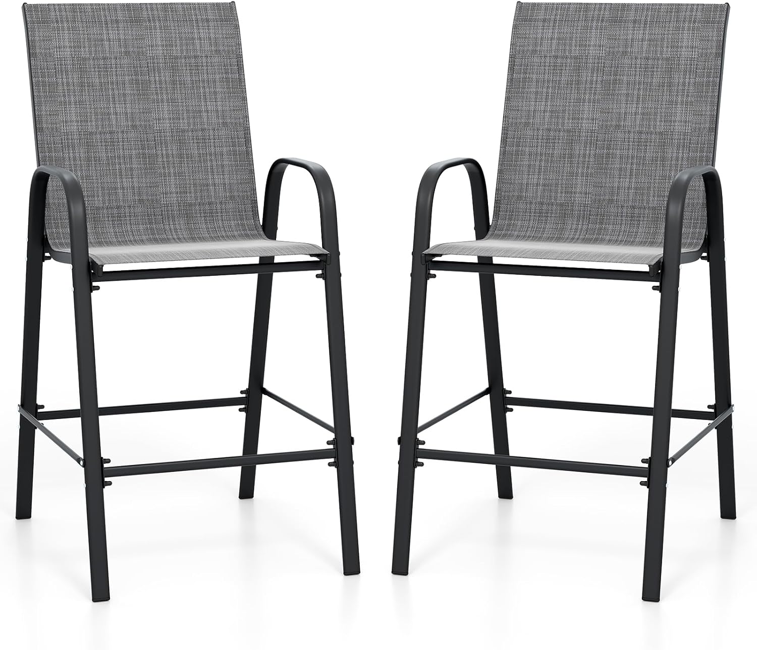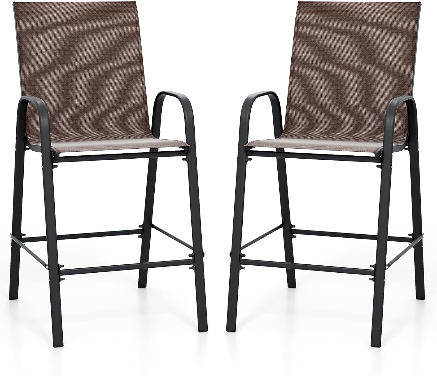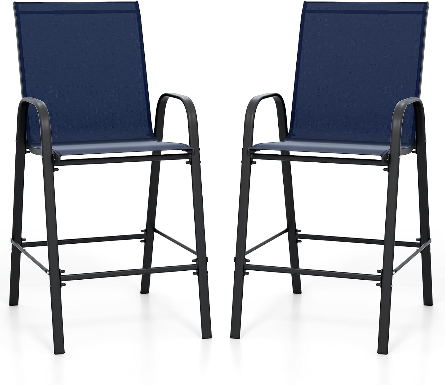 Description:Enjoy a comfortable and relaxing outdoor time with the 29" bar stool set, featuring premium fabric that is breathable, tear-proof, and sun-protective. With ergonomic features like a high backrest, curved armrests, and a 11.5" high footrest, these outdoor barstools offer optimal support. The spacious seat, measuring 21" by 16", ensures ample room for relaxation. Constructed with a sturdy metal frame that supports up to 330 lbs, these bar chairs come with protective foot pads for added stability. Perfect for various outdoor settings, such as decks, poolside, and front porches, these stylish stools are designed to complement bar tables between 40" and 43" in height.Features:Selected fabric is breathable, sun-protective, tear-proof, and anti-fadingDesigned with an inclined backrest that offers optimal back supportCurved armrests ensure perfect relaxation for armsBoasts an enlarged seat, which features a wider surface for comfort11.5" high footrest ensures leg relaxation and reduces fatigueComes with a heavy-duty metal frame, making it robust, stable, and enduringEquipped with anti-slip foot pads to enhance the sitting stabilityPerfect choice for decks, gardens, patios, front porch, poolside areas, etcPlease avoid rain exposure for prolonged service lifePlease note that the bar chair set requires assemblySpecifications:Color: Brown & Black/Black/Gray & Black/Beige & Black/Navy Blue & BlackMaterial: Fabric, MetalOverall Dimensions: 24.5" x 30" x 51"(L x W x H)Size of Backrest: 20.5" x 24.5"(L x H)Size of Seat: 21" x 16" (L x W)Height of Seat: 29"Height of Footrest: 11.5"Suitable Table Height: 40"-43"Max Load Capacity: 330 lbsNet Weight of Each Chair: 14.5 lbsPackage Includes:2/4 x Bar Chairs1/2 x User Guides