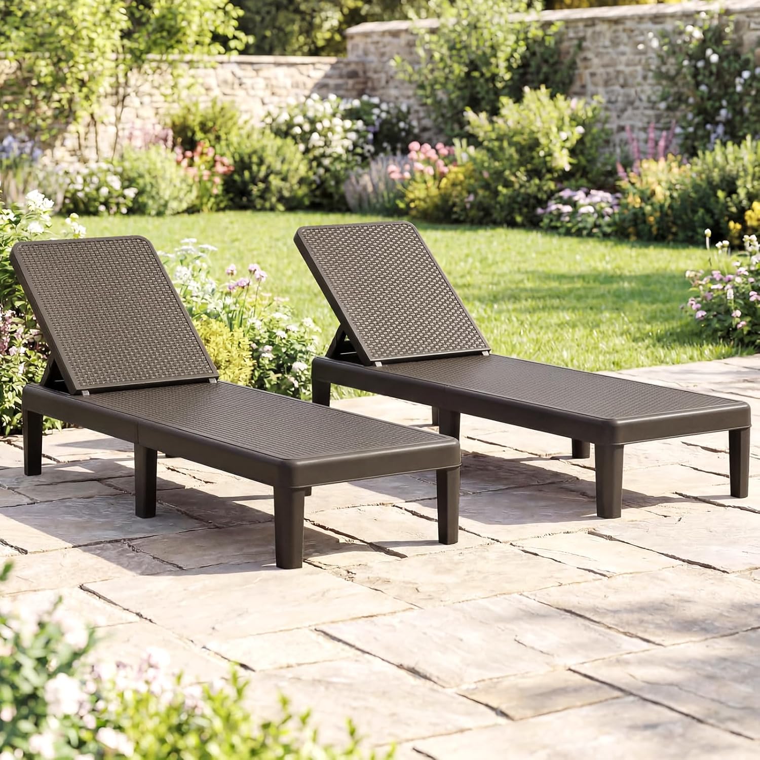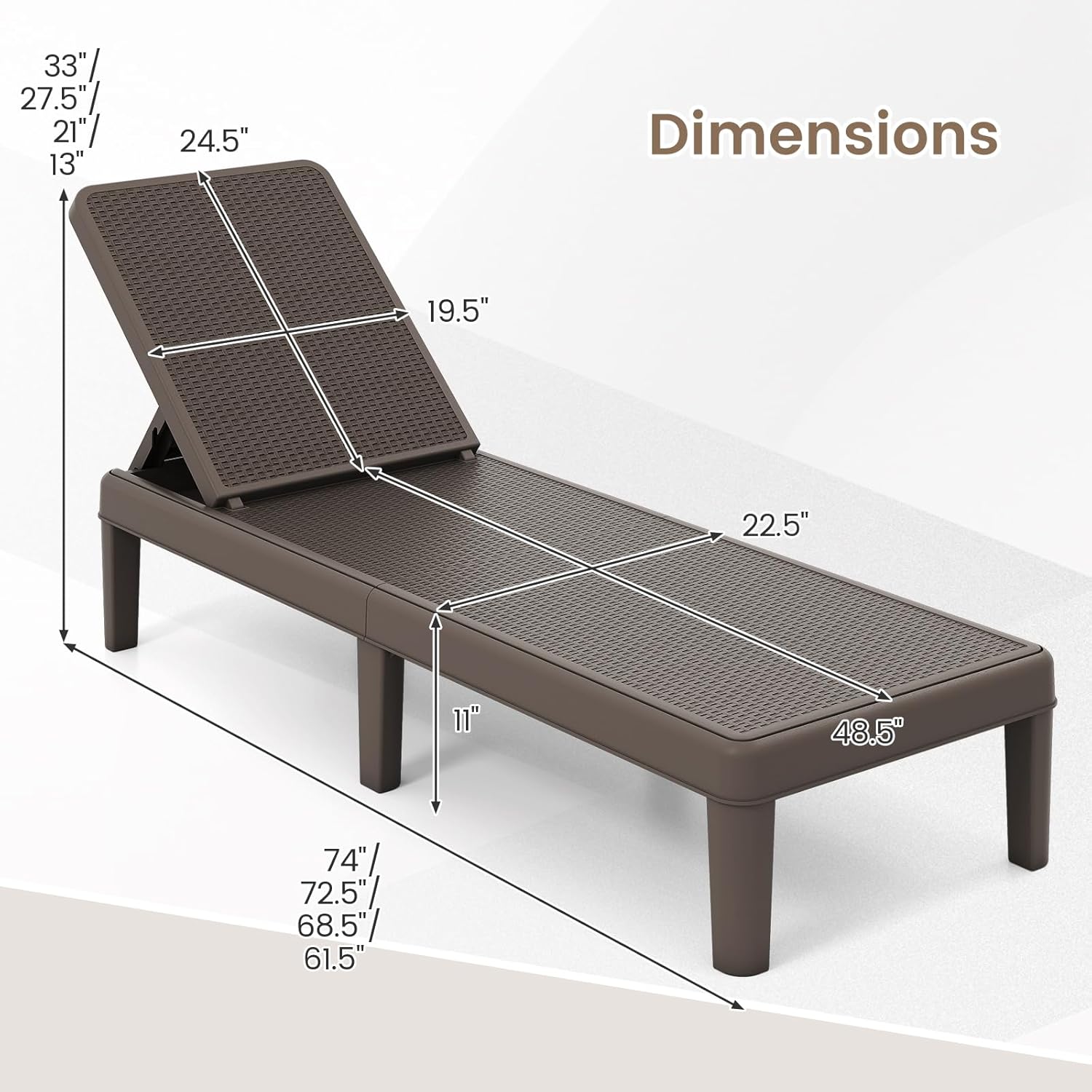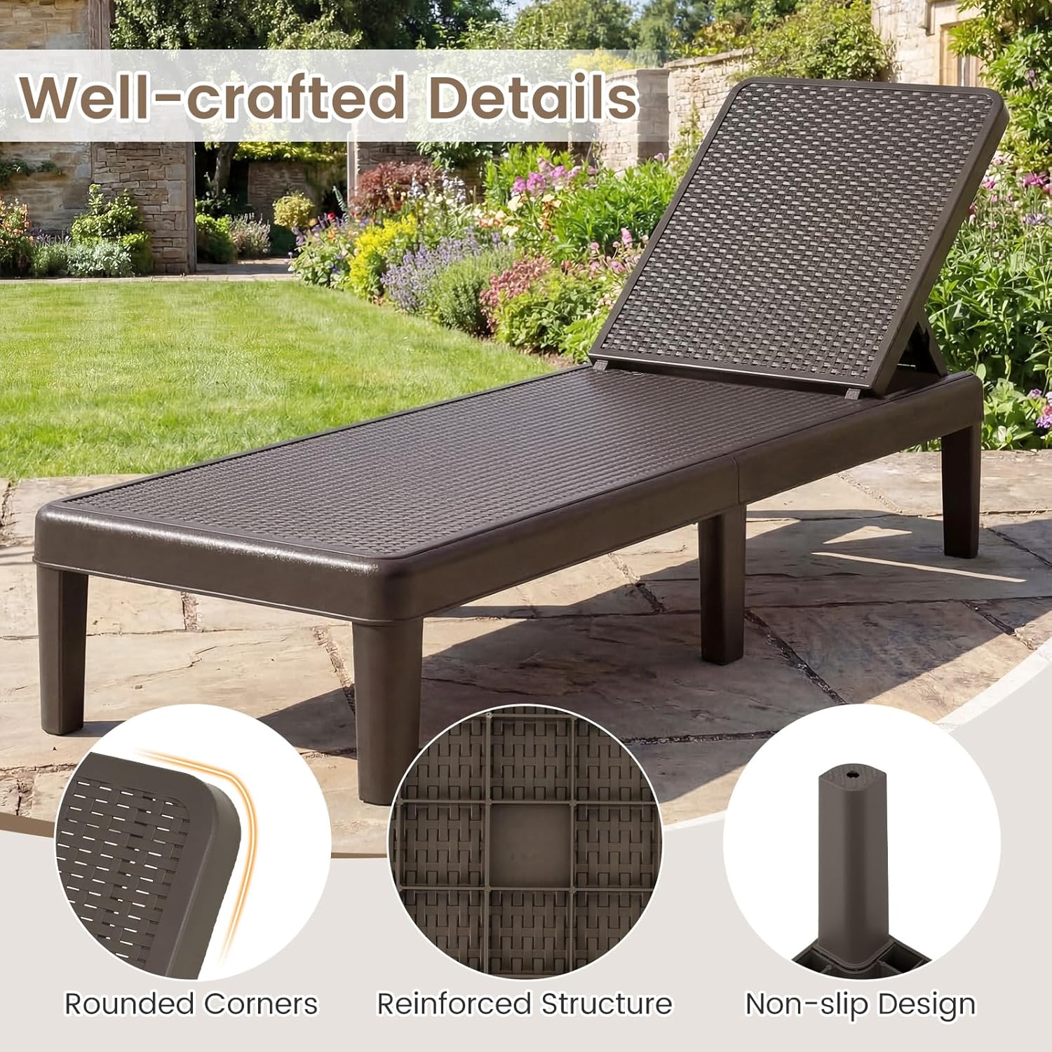 Transform your outdoor space! Dive into unparalleled comfort with our all-weather chaise lounge! Boasting an easy-to-clean, sun-resistant design, this lounger is perfect for every season. Fancy a change in scenery? Its 3-angle adjustability caters to every relaxation need, whether you're soaking in the sun or losing yourself in a page-turner. Strong, stable, and stylish with a chic rattan finish that breathes elegance and breathability, it's your go-to for staying cool. Best part? Setup's a breeze - click on the legs and unwind. Fits flawlessly in any outdoor spot, be it by your pool or on the patio. Don't wait – make this captivating yet sturdy lounger yours and enhance your outdoor lounging experience!