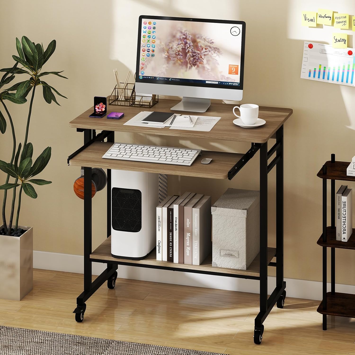 DescriptionDiscover the ultimate space-saving solution with our sleek, ultra-functional mobile computer desk. Perfect for any setting, it glides effortlessly on whisper-quiet, wear-resistant casters, with two that lock for unwavering stability. Ready to support large load capacity, this robust metal desk is your go-to for everything from hardcore gaming to high-stakes professional work. Organize like a pro with a pull-out keyboard tray, a spacious bottom shelf, and handy hooks - all designed to keep your essentials at your fingertips. Despite its compact size of 31.5" x 19.5", it ensures ample functionality in tight spaces. Plus, cleaning is a breeze and safety’s a given with its rounded corners. Upgrade to flawless efficiency today!FeaturePractical with a spacious tabletop, a keyboard tray and a bottom storage shelfAmple space for laptops, books, and other work essentials3 removable hanging hooks offer a flexible storage solutionFour 360° rolling casters, two are lockable, ensure easy mobilityMade from quiet and wear-resistant rubber material that is friendly to floorWell-crafted design ensures a long service lifeEasy-to-clean surface saves time on maintenanceRound corners avoid accidental injuriesVersatile small rolling desk for bedroom, living room, study and more Assembly needed SpecificationColor: Rustic Brown + Black/Grey & Black/White & BlackMaterial: Engineered Wood, MetalOverall Dimensions: 31.5" x 19.5" x 31" (L x W x H)Dimensions of Keyboard Tray: 24.5" x 12" x 3" (L x W x H)Dimensions of Bottom Shelf: 27.5" x 12" x 17.5" (L x W x H)Bottom Shelf from Ground: 9.5"Weight Capacity of Tabletop: 180 lbsWeight Capacity of Keyboard Tray: 25 lbsWeight Capacity of Shelf: 70 lbsNet Weight: 29 lbsPackage Includes:1 x Rolling Laptop Desk3 x Removable Hooks1 x User Manual