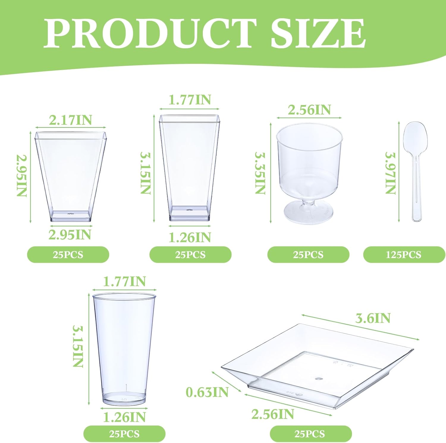 Features: The transparent color of these plastic dessert containers and spoons can showcase your appetizers, desserts and finger foods beautifully, adding a simple but elegant atmosphere to your desserts. The two shapes of our individual dessert cups is modern and classic, which will win likes from most people, and can make your desserts look more exquisite. Specifications: Material: plastic Color: clear Size: Square dessert plate: 3.54 inches/ 9 cm in length Spoon: about 3.94 inches/ 10 cm in length Capacity: Square dessert cup: about 5 oz/ 150 ml, 3 oz/ 90 ml Goblet: about 5 oz/ 150 ml Round dessert cup: about 3 oz/ 90 ml Package includes: 50 x Square dessert cups 25 x Clear plastic plates 25 x Dessert goblets 25 x Round dessert cups 125 x Spoons Notes: Manual measurement, please allow slight errors on size. The color may exist a slight difference due to different screen displays.