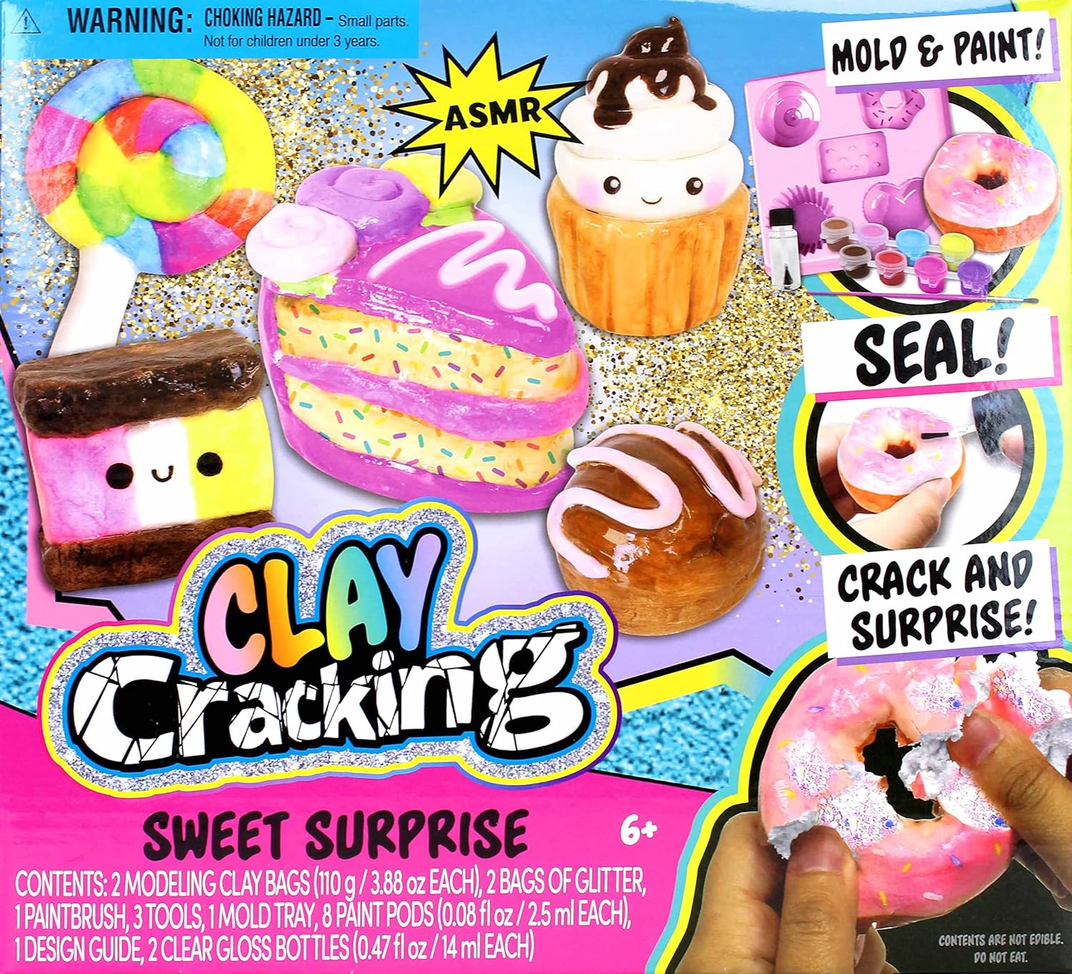Bringing to you one of the top newest ASMR trendsCLAY CRACKING. Sculpt and paint your designs, add the special gloss to seal and then CRACK! This surprise set features glitter that you can hide in your clay designs and have a friend guess what's inside! Share your reveals on social media too! It’s fun to make and so satisfying to crack!