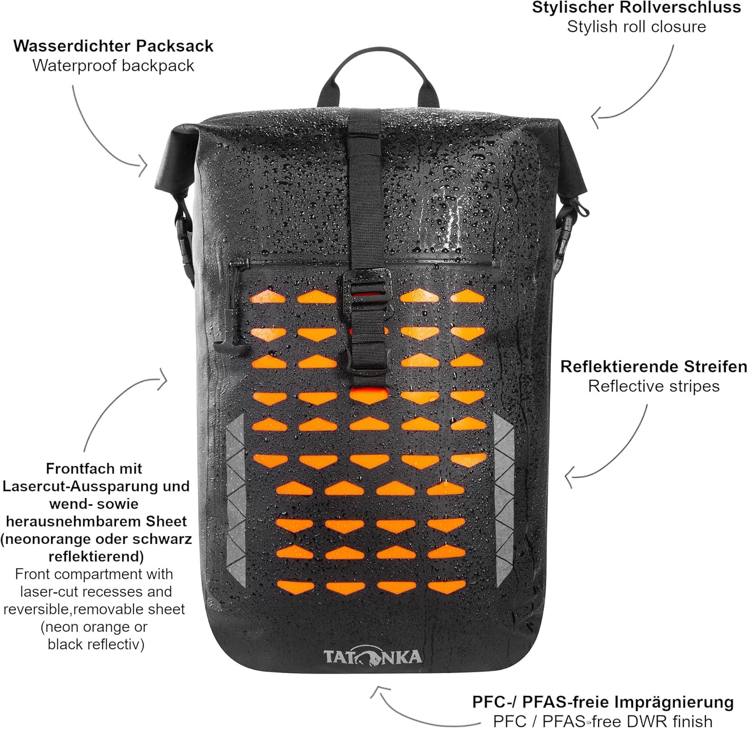 Commuter Rolltop 30 WP by Tatonka: Robust waterproof backpack for cycling and everyday use. Waterproof bicycle backpack (HF welded) with roll closure and 30 litre volume. The Commuter rolltop 30 WP offers comfortable wearing properties thanks to the padded back system, and on the bike it can be firmly fixed to the back with chest and waist strap. Backpack front and shoulder straps are equipped with reflective elements. The Commuter Rolltop 30 WP features a large main compartment with removable, padded laptop pocket and a flat front compartment that can also be used as a mounting panel for gear thanks to the laser-cut cut-outs. More product details: • Vent comfort carrying system. • Ergonomically shaped, padded shoulder straps. • Load control strap, height-adjustable chest strap, removable waist strap. • Multi-function panel in laser cut design for attaching additional equipment to the sides • Carry handle, zip front pocket, reflective stripes, reflective elements on the shoulder straps. • Waterproof roll closure, multi-function panel in laser cut design for attaching additional equipment to the front, removable, padded laptop bag suitable for 15.4 inches, PFC/PFAS-free waterproofing • Dimensions: 50 x 32 x 16.5 cm. • Weight: 1.28 kg • Volume: 30 litres. • Material: 420 denier nylon TPU. /// Tatonka - Bavarian family business with fair and transparent production. Fair, social and transparent - Tatonka brand products are manufactured in our own production facilities under social, fair and transparent conditions. The production can be viewed by anyone during operation. Information at openfactory.tatonka.com. /// Traceability by Tatonka: Transparency creates trust Traceability means traceability. "Traceability by Tatonka" means that you can track the path of Tatonka products from purchasing materials to manufacturing to shipping to the country of destination. For more information, please visit Tatonka.