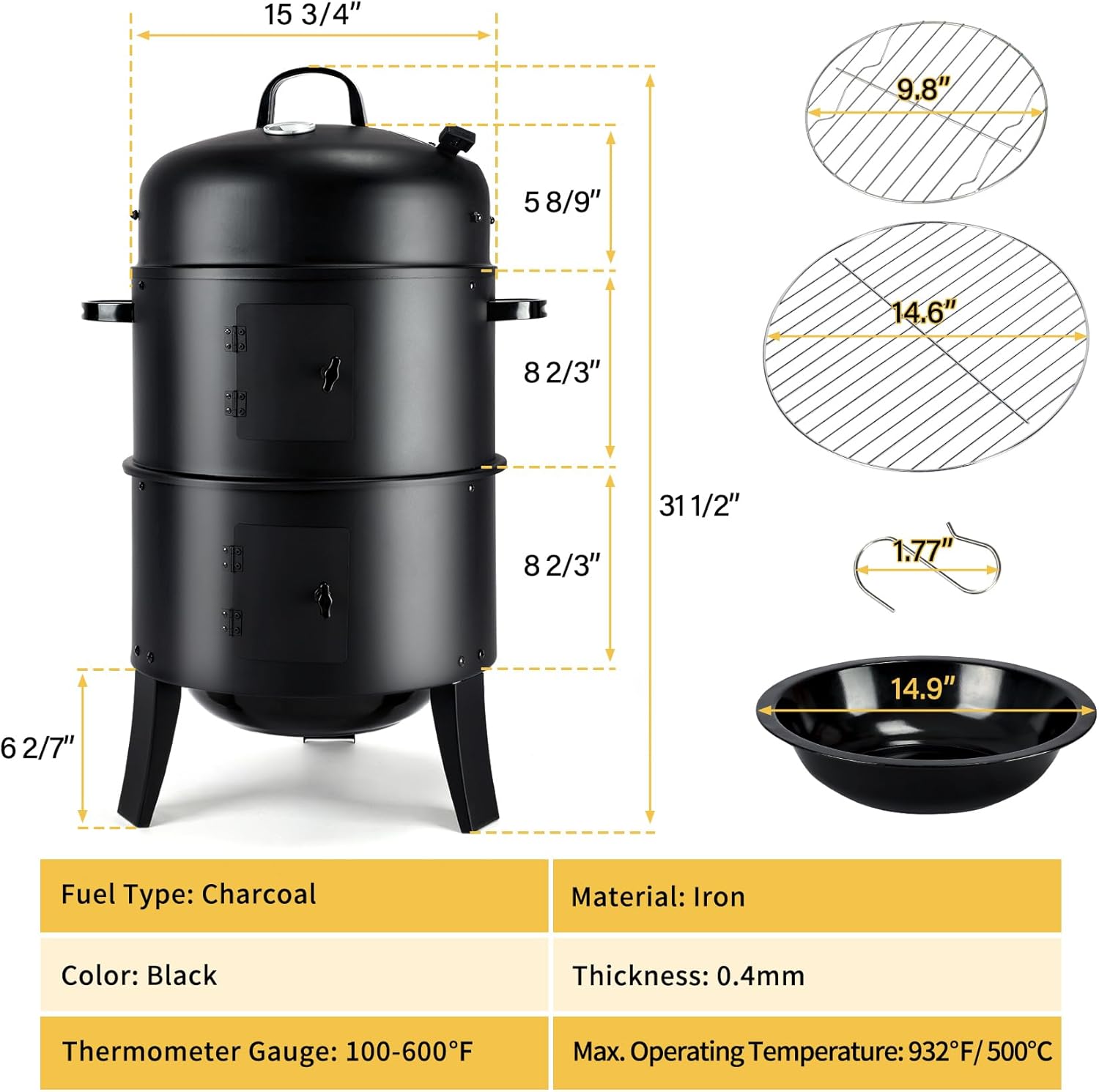 | Included Components | Air Vent, Hanging Hooks & Crossbars, Other Accessaries, Smoker, Thermometer |