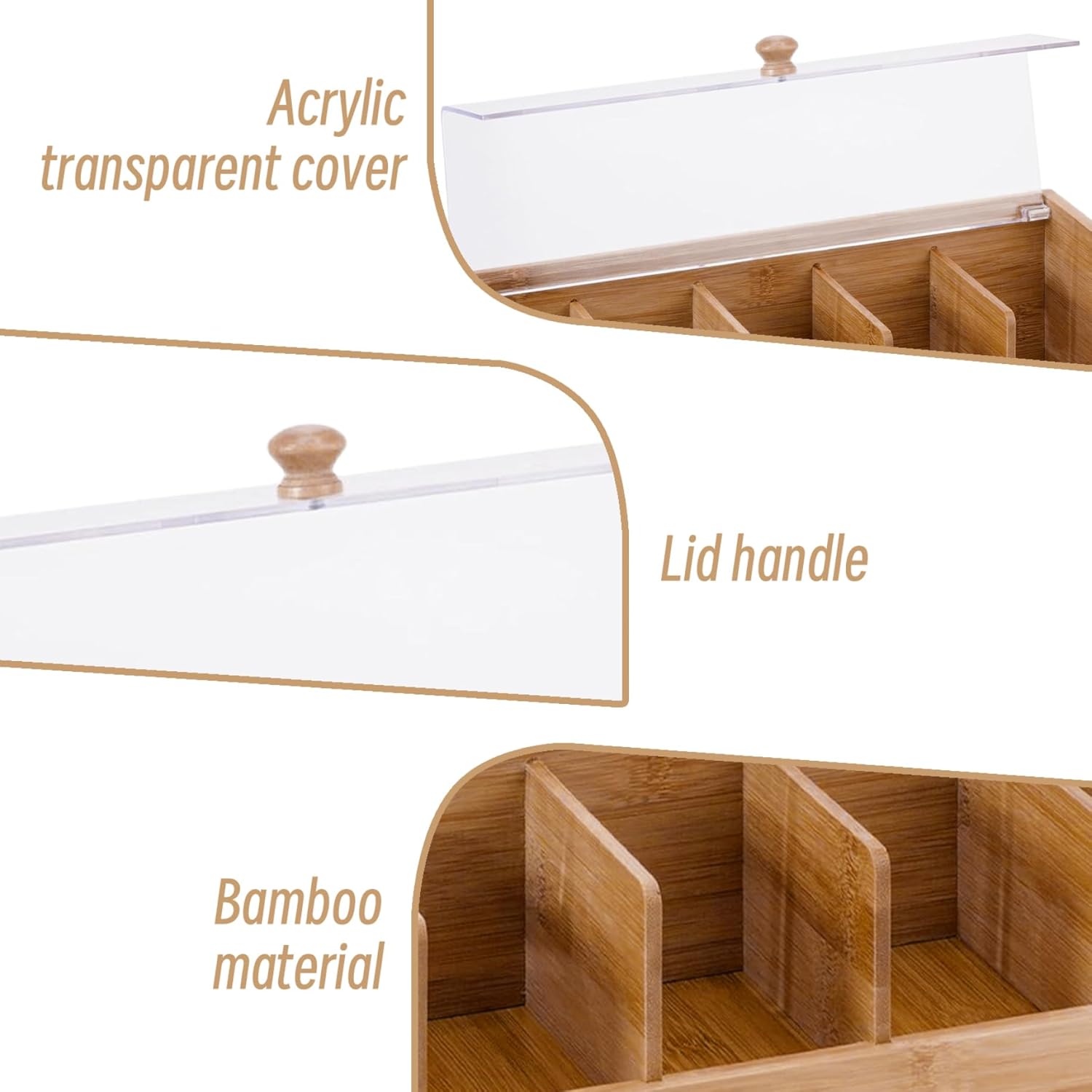 Description: Keep your tea collection tidy and stylish with the Natural Bamboo Tea Selection Box, a practical and elegant storage solution. Featuring 5 spacious compartments, this tea organizer is perfect for tea bags, coffee sachets, and small kitchen essentials. Crafted from eco-friendly bamboo, it includes a transparent, dustproof lid for freshness and easy viewing. Ideal for kitchens, offices, or as a thoughtful, this versatile tea caddy combines functionality and charm. Features:. Tea Selection Box. -Color: As shown. -Material: Bamboo. -Size: 36x11x9.5 cm/14.17x4.33x3.74 inch. Note: Manual measurement, please allow slight errors on size. The colors may exist slight difference due to different screens. Package Including 1 * Tea Selection Box
