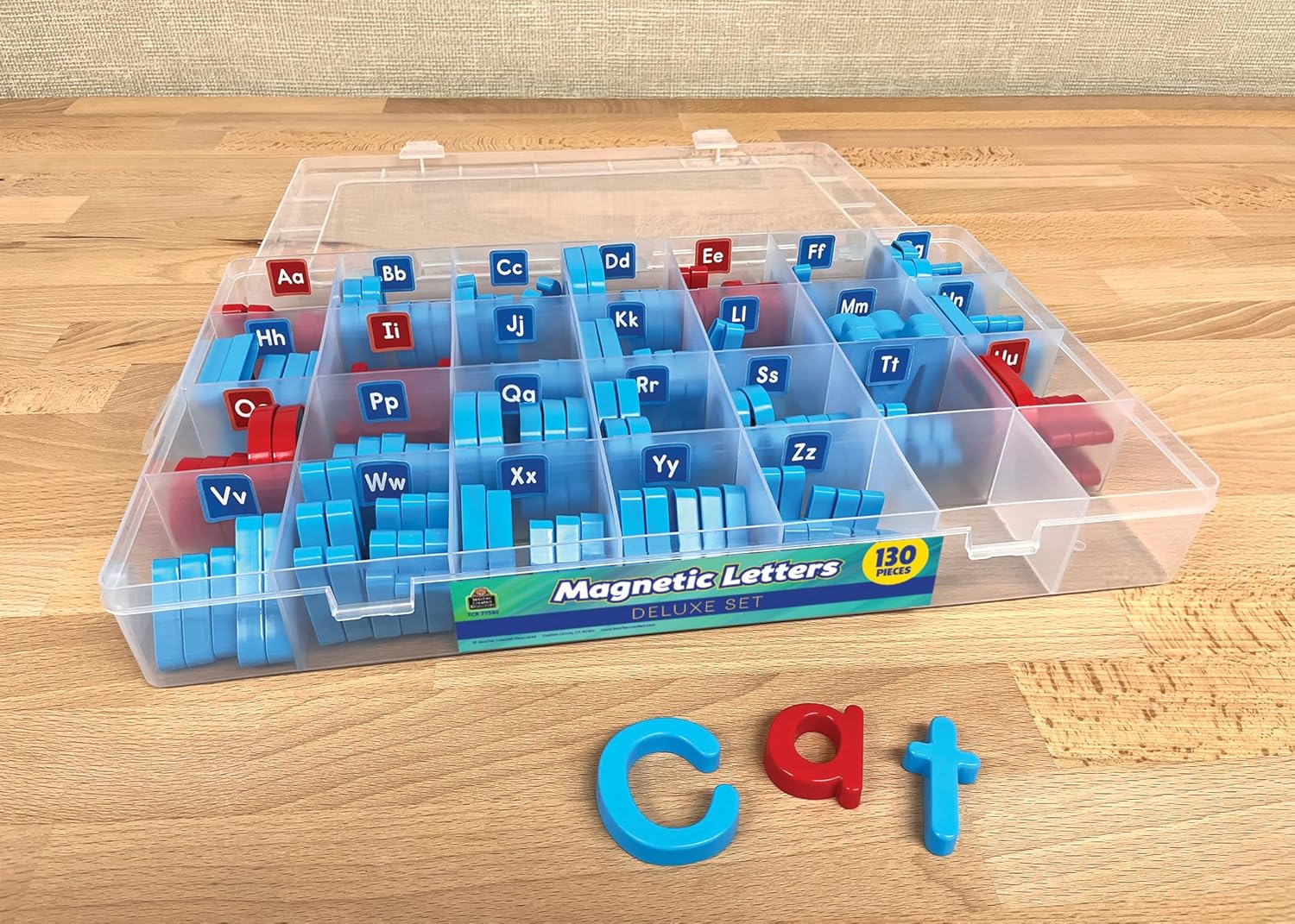An everlasting tool in the arsenal of materials for young learners, magnetic letters are a must have for early education. While easily distinguishing between vowel letters in red and consonants in blue, children can transition from recognizing individual letters to forming words and sentences. Set comes in a sturdy plastic case with a handle for easy transportation and storage, plus provided labels make organization easy. Set includes 52 uppercase letters (2 of each letter) and 78 lowercase letters (3 of each letter). 130 total pieces.