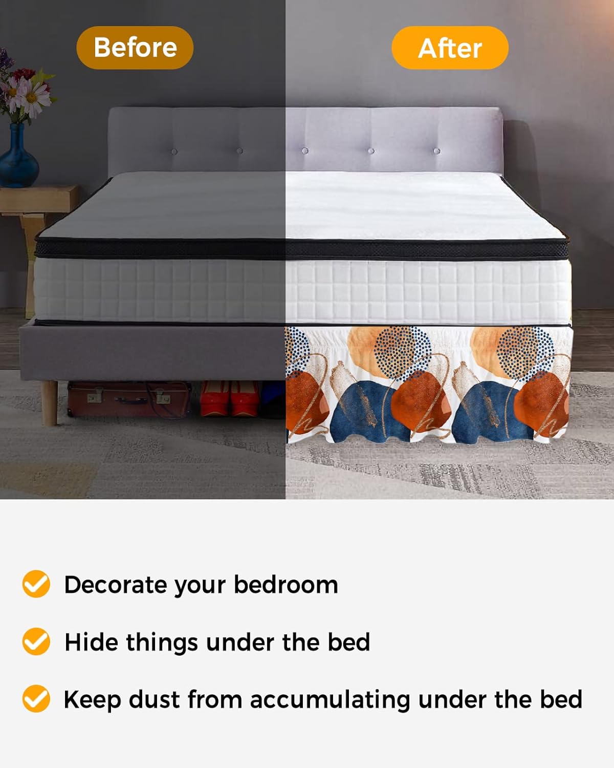 Features:Durable linen with polyester bed skirt for boys room.Thick bed skirt for footboard is various in rainbow colors.Machine, hand and dry washable bed skirt for day bedCollege extra long bed skirts queen for adjustable bed is perfect for daily use.Bed skirts for metal platform bed is a nice gift for women, men, kids on Father's/Mother's Day, wedding, engagement, anniversary.Clearance queen skirt for bed: Great for the you, decent bed skirts for california king for the money highly recommend.Bed skirts for queen size bed easily match air mattresses pads & toppers, bed canopies & drapes, sheets, bed base, runners & scarves, bedspreads, coverlets and other bedding sets collections.6 Sizes:Dorm bed skirt queen size 16 inch dropMini crib bed skirt queen size 18 inch dropKing size dust ruffle bed skirt wrap around 16 inch dropKing size dust ruffle bed skirt wrap around 18 inch dropRuffle bed skirt california king size 16 inch dropLofted bed skirt california king size 18 inch drop6 optional sizes bedskirr & widely usage bed skirt for metal platform no box spring.You Will Get:1 x bed skirts for metal platform bedWe have confidence in our bed skirts for queen bed. Any question about bed skirts for canopy bed, please sent us email.Return Policy:(1)Bed skirts for full size bed is cheap.(2)If there is a quality problem with bed skirts for twin size bed, we can refund or resend bedskirt for adjustable bed base for replacement;(3)You can initiate a return application at any time, it will be passed in seconds, the return label will be given in seconds.Tips:Only bed skirts for adjustable bed king, bed skirt pins or holders do not included.There may be a 0.3 inch error of the bedskirt for adjustable base king.