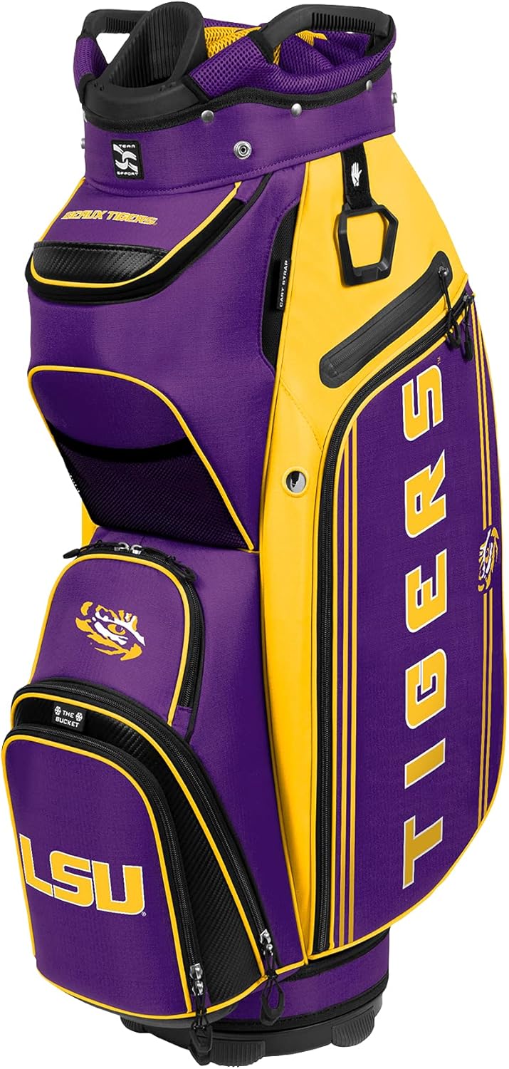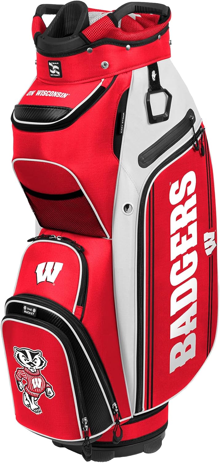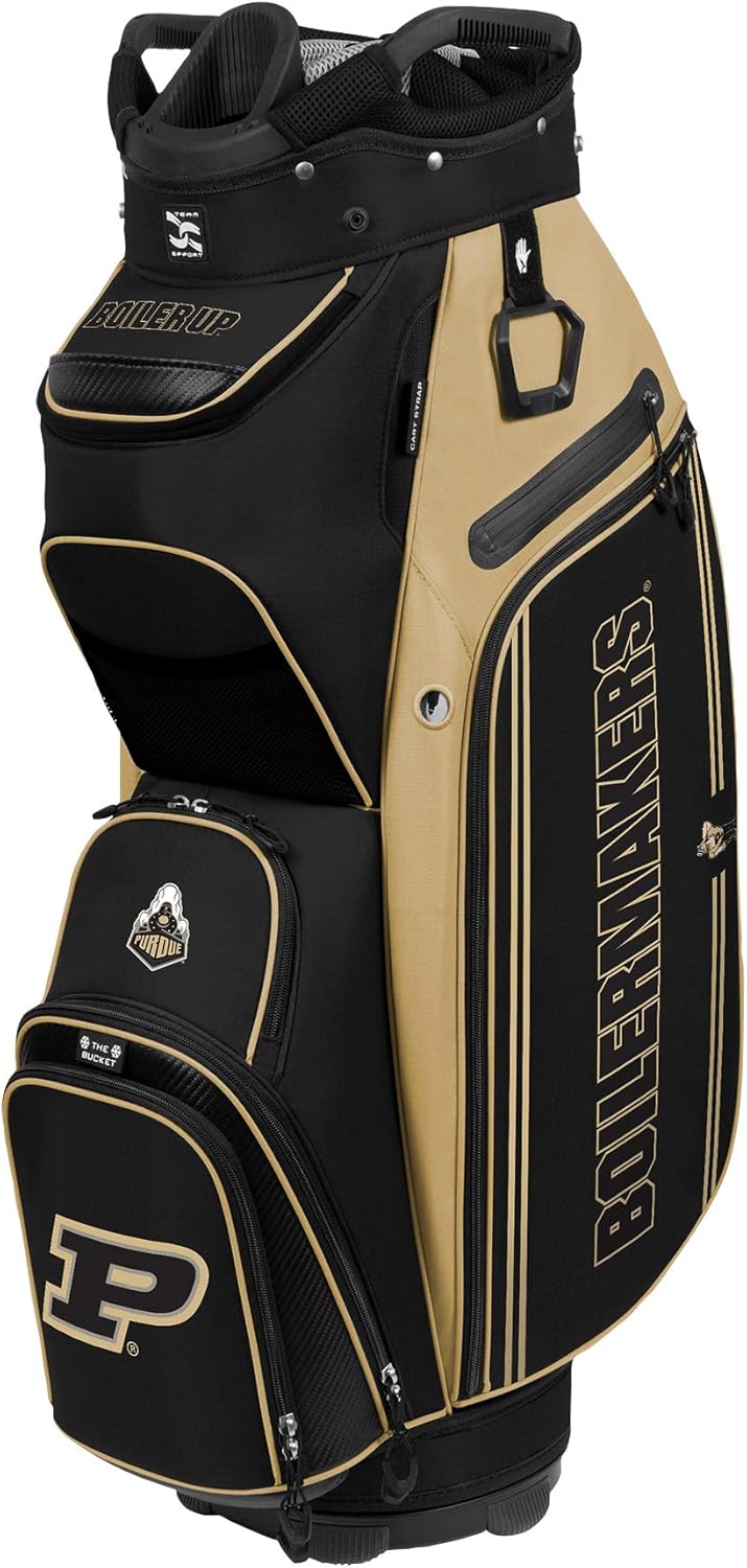 The Bucket III Cooler Cart Bag offers the latest innovations, ample storage, and lasting quality. The next generation in Team Effort golf accessories is made possible through collaboration with industry-leading golf experts and representatives of numerous professional sports teams and colleges. Featuring commanding team trademarks and exceptional features, the Bucket III is a must-have for showcasing your team pride on the course. Officially licensed. The Bucket III ushers in new features, including 8 full-length dividers, and a quick-access pocket with magnetic closure. The bag sees the return of its signature thermal-lined cooler pocket with an insulated drainage port. Features: 14-Way organizer top, with front putter well, provides superior club management 8 Full-length dividers Two velour-lined valuables pocket Oversized towel ring Quick-access pocket with magnetic closure Built-in cooler with drain port Glove patch Pen sleeve Embellished with NCAA team trademarks