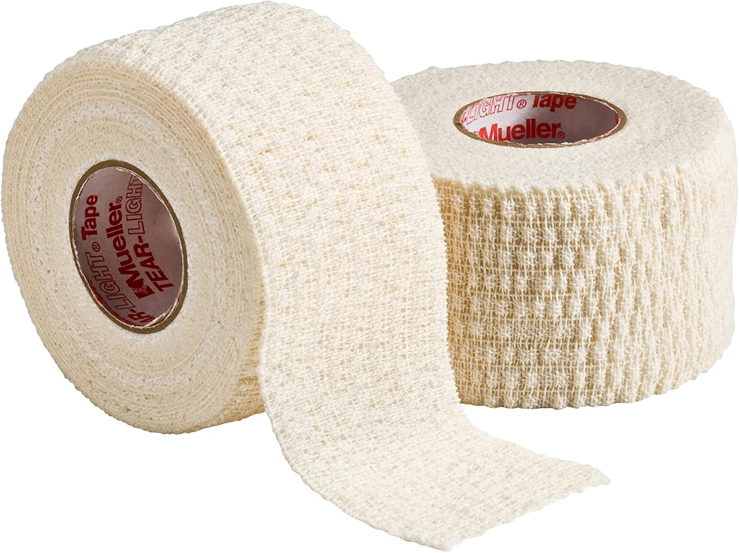 Mueller Tear-Light Tape Lightweight elastic adhesive tape with superior adhesion and excellent conformability. Easy tearing, easy unwinding. Ideal for securing lateral knee braces, compression wrap, or fixation bandage for padding and cold packs. Use for spatting to help support ankles and secure cleats, cover logos, or secure laces and padding. Not made with natural rubber latex. Available in White or Black.