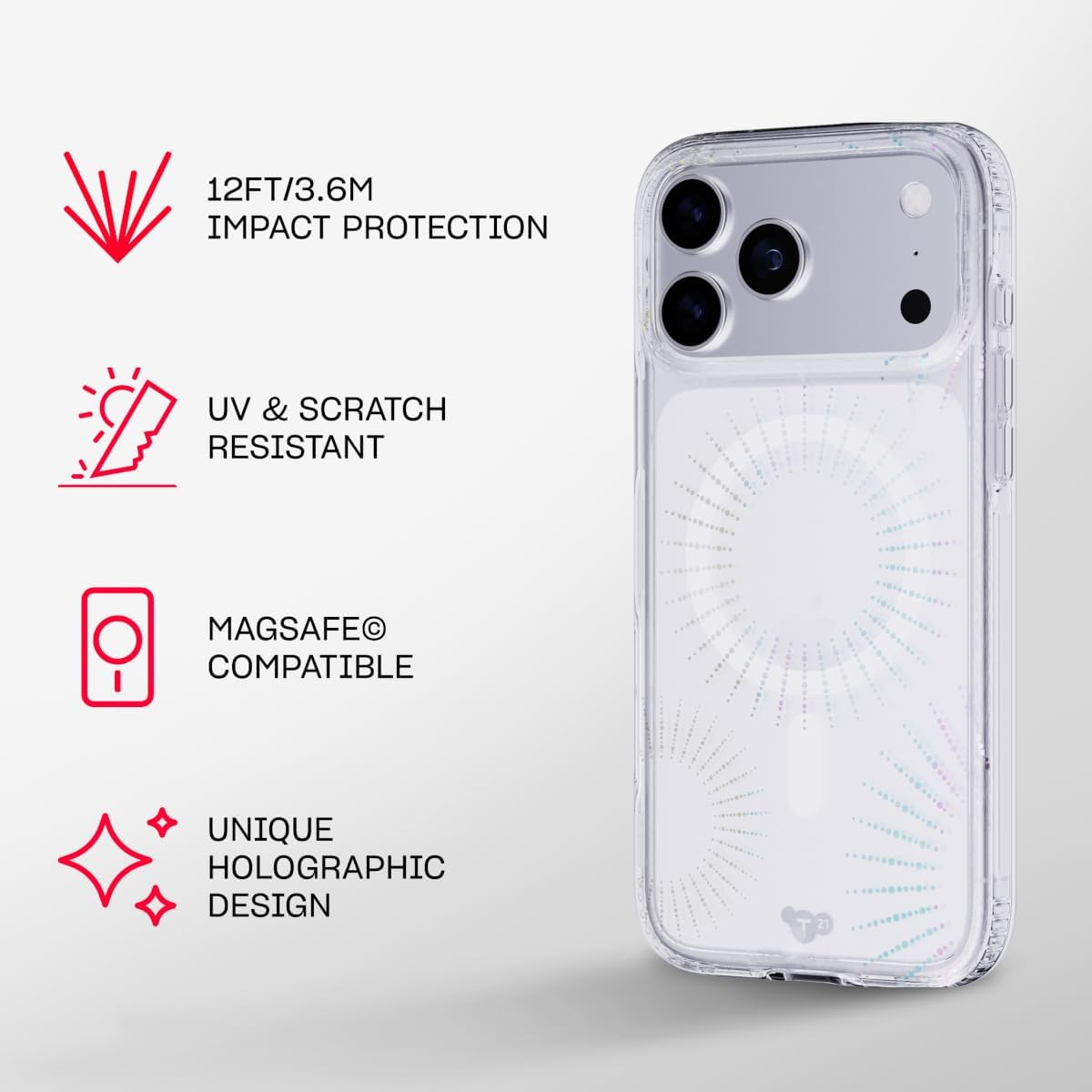 Protect your iPhone 17 Pro Max with the tech21 EvoSparkle — a modern protective case designed to keep your phone safe without compromising style or functionality. Crafted with proprietary impact-absorbing materials, this case defends your phone against drops and abrasions while maintaining a slim, ergonomic design. Built-in magnets enable full compatibility with Apple’s MagSafe ecosystem, so you can connect to wireless chargers, wallets, and car mounts with confidence. The Lunar finish adds a unique visual touch that complements your device’s aesthetic. Designed by tech21’s team of scientists and engineers, this case blends advanced protection with everyday usability — backed by years of trusted innovation.
