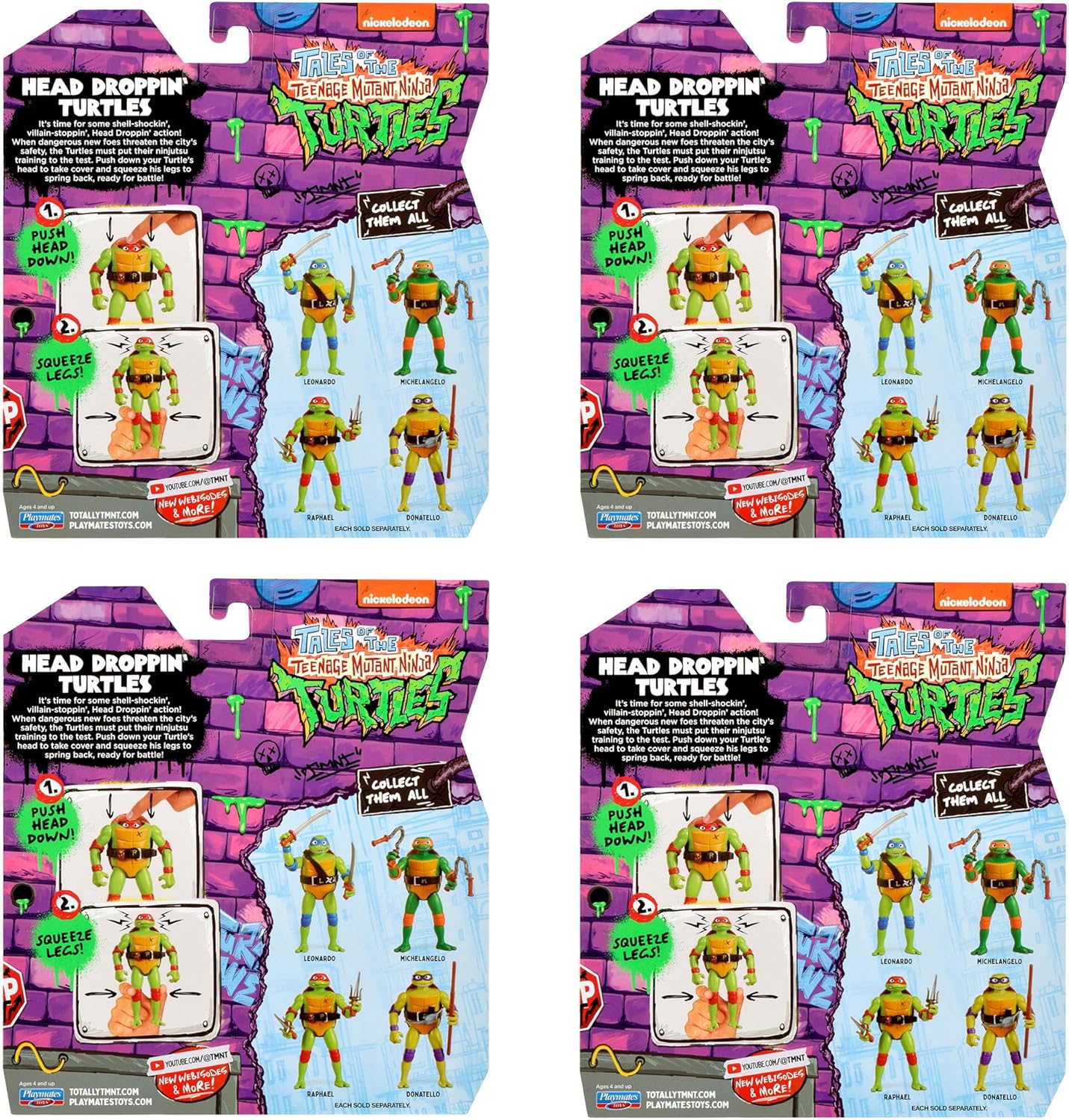 It’s time for some shell-shockin’, villain-stoppin’, Head Droppin’ action! When dangerous new foes threaten the city’s safety, the Turtles must put their Ninjutsu training to the test. Push down your Turtle’s head to take cover and squeeze his legs to spring back, ready for battle! The Head Droppin' Turtle Basic Figure 4-Pack includes Head Droppin' Leonardo, Head Droppin' Donatello, Head Droppin' Michelangelo, and Head Droppin' Raphael.