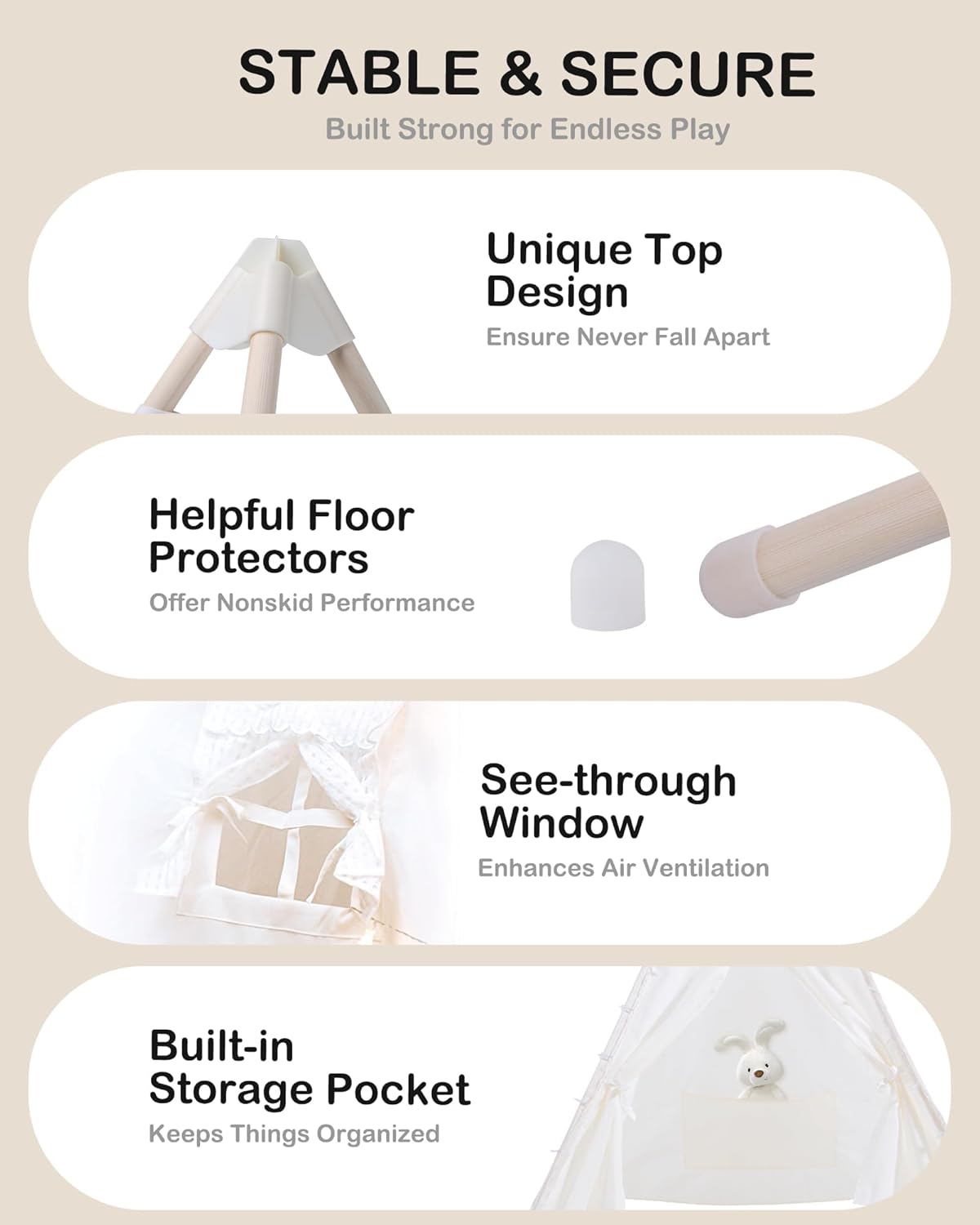 | Included Components | 1 washable cotton canvas kid teepee tent (65''*51''*71''), 1 inflatable mattresses (73.2''* 30''* 8.7''), a bright star light strings (118"), 16 detachable plastic sticks, 12 plastic stick connectors, 1 manual inflation pump, 4 non-slip bottom rubber caps, 5 different balloons , 1 top stabilizers and 1 topside cute cap, 1 manual |