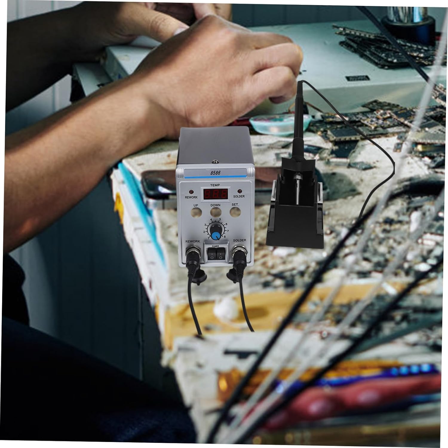 Package List 1 x set of soldering x nozzle 1 x tweezer 1 x solder sucker Features -Air flow rate: 120 L/min Welding Repair Tools -Iron tip to ground resistance: less than 2Ω solder kit -Size(nozzle):4.50X3.00X2.30cm/1.77X1.18X0.90in soldering station kit high-power -Size(tweezers):10.50X0.80X0.50cm/4.13X0.31X0.20in soldering station for hot air -Material:ABS,aluminium alloy solder iron kit -Size(station):17.00X13.00X9.50cm/6.68X5.11X3.73in welding soldering station -Color:Assorted Color hot air rework station -Size(solder sucker):18.50X2.00X2.00cm/7.27X0.79X0.79in welding tool -Temperature adjustment range: 100-500℃ 200-500℃ hot air rework supplies -Noise: <45dB practical soldering station -Applicable voltage:AC110 hot rework station -Power :700Wmax 60W soldering station helping hand -Soldering tip to ground resistance: less than soldering stations -The inclusion of a bent tip tweezer and solder sucker enhances the usability of this tool, making it easier to handle and remove solder tiltable display soldering stationGoods Informationsoldering rework station Using reliable materials, durable.Soldering Hot Air Rework Station This is your ! With this product, and you can have professional and enjoyable looking experience.welding tools Note: This item comes with US plug, please confirm the voltage of your area before purchasing.soldering stations durable soldering station ? If so, take at this product.tiltable display soldering station The unique design and craftsmanship ensure its popularity and practicality