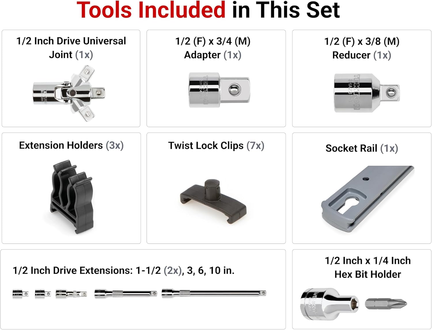 Tekton hand drive accessories complement your existing socket system. This set includes 1/2 inch drive 1-1/2, 3, 6, and 10 inch hand drive extensions, along with a universal joint, an adapter, a reducer, and a hex bit holder. Attach an extension to your drive tool for reaching past obstructions or into tight, narrow spaces with your socket. Reach around obstructions and access fasteners at an angle with the universal joint. The adapter allows you to adapt 1/2 inch drive tools to 3/4 inch drive sockets, and the reducer adapts 1/2 inch drive tools to 3/8 inch drive sockets. The hex bit holder allows you to use 1/4 inch hex shank bits with 1/2 inch drive tools. The included organization rail comes with twist lock clips and top-mount extension holders. Ridges along the rail prevent the clips and holders from sliding, and a keyhole slot helps it lock into a tray.