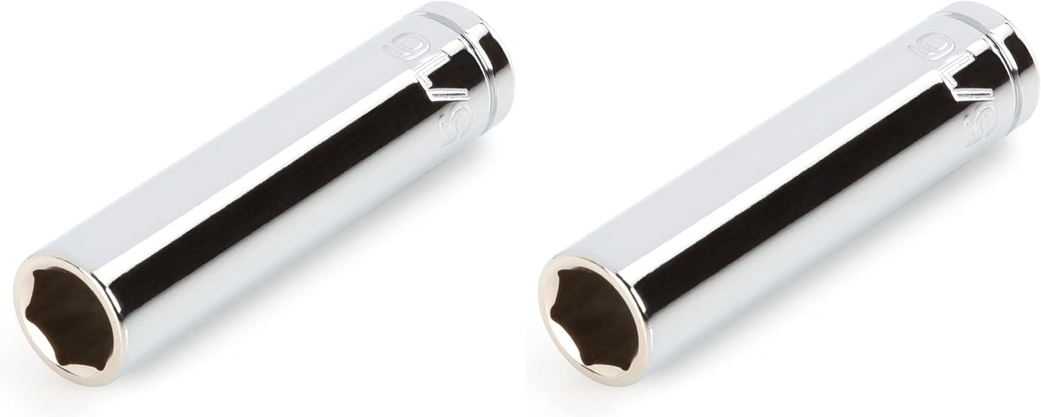 Tekton deep sockets have large, stamped markings that are permanently impressed into the material by a roll-stamp die and are as large as possible while still being readable along the socket's curved surface. The exterior of the socket is chrome-plated to resist corrosion and wipe clean to a mirror finish. The interior is protected against corrosion with chrome plating that is supplemented with a clear coat or painted finish where needed for full coverage. The 6-point socket opening provides an exact fit and maximum contact for hex fasteners. Radiused corners prevent fastener round-off by applying force to a fastener's flat sides, rather than its corners. Four detent grooves provide a secure connection with the retaining ball of a drive tool, and beveled inner rims help guide the socket onto other tools.