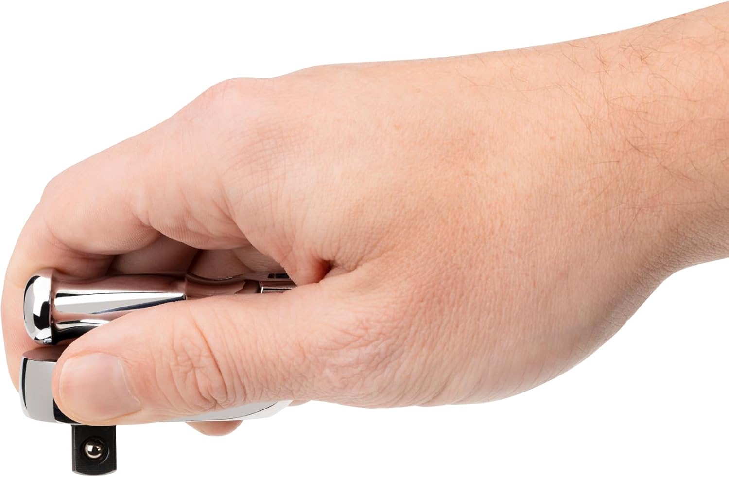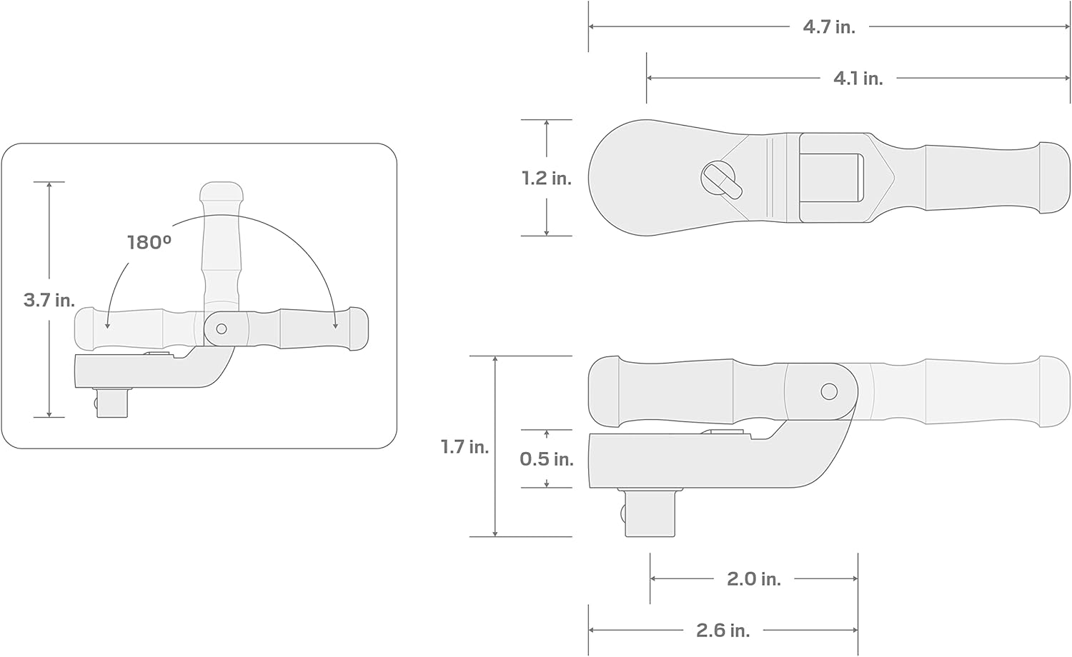 Tekton 3/8 inch drive folding ratchets have a 90-tooth gear that produces a working swing arc of 4 degrees. The single half-moon pawl maintains 9 teeth engaged with the gear at all times, ensuring that it won't slip or skip under stress. The classic non-quick-release drive tang retains sockets with a spring-actuated detent ball—push the sockets onto the ratchet and pull to remove them. The non-locking joint gives the handle a continuous of motion. It's designed with just the right amount of friction so that the handle won't flop around. Unlike conventional "low profile" designs that focus on controlling only the thickness of the head, we reduced the size in every dimension: length, width, and height. Tekton ratchets meet (and most far exceed) the industry standard for proof torque, a measure of strength verified by a single-cycle test that applies torque until the specified value is reached without failure or any permanent deformation.