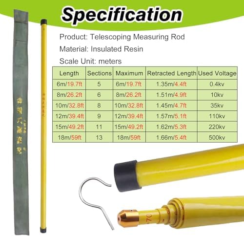 Are you concerned about electrical safety while measuring heights? Look no further than our Insulated Telescoping Hot Stick, designed for professionals who demand precision and reliability in a range of applications. Crafted from durable resin, this measuring tool is available in multiple sizes: 6m (19.7ft), 8m (26.2ft), 10m (35.8ft), 12m (39.4ft), 15m (49.2ft), and 18m (59ft). Its telescopic design allows for seamless extension and retraction, making it easy to store and transport. Whether you're working on telecommunication towers, street light maintenance, substations, or in forestry, our hot stick is engineered to meet the diverse needs of your projects. Key features include clear height graduations for accurate measurements and a lightweight construction that ensures effortless handling during extended use. The secure snap-lock mechanism provides stability at any height, giving you confidence in your measurements. With a rubber-insulated handle, safety is prioritized, reducing the risk of electrical hazards while you work. For added convenience, the Insulated Telescoping Hot Stick comes with a compact storage bag, allowing you to take it wherever your work takes you. Choose our Insulated Telescoping Hot Stick for a reliable, safe, and efficient measuring solution that enhances your productivity and gives you peace of mind on the job. Remember to check the size that best suits your needs to ensure optimal performance.