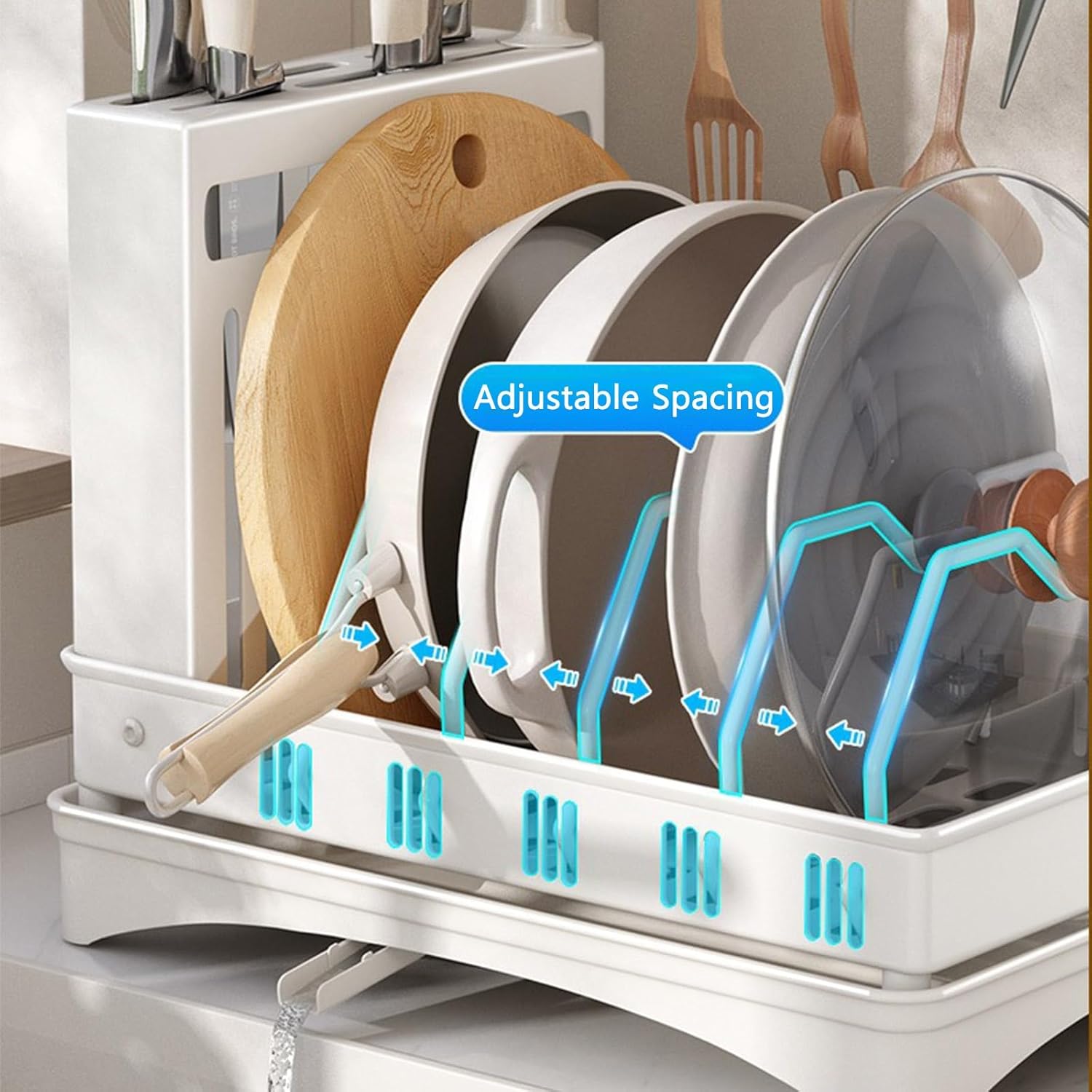 A Great Organizer. If you love organizing and finding ways for more functionality. This pot rack would be a great gift. This cabinet organizer can be set up differently to meet your needs. Sturdy and easy to assemble for your convenience. 5 adjustable compartments with snap-on design, the spacing between each layer can be adjusted and removed at will, categorized storage keeps your cabinets organized. Make A Huge Difference in Space Saving and Neatness!Specifications:- Material: Carbon steel + PP Plastic- Color: White-Size: L24 * W36 * H45 cm / L9.4 * W14.1 * H17.1inPacking include:- 1 x Multifunctional Pot & Pan Organizers RackNote:Please measure the size of your cabinet before purchasing our pots organizer. We only sell pot and pan organizers racks, not other display props.Manual measurement, please allow slight errors on size.