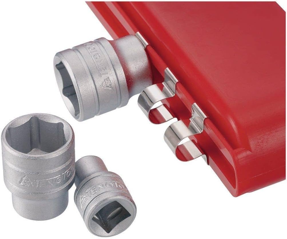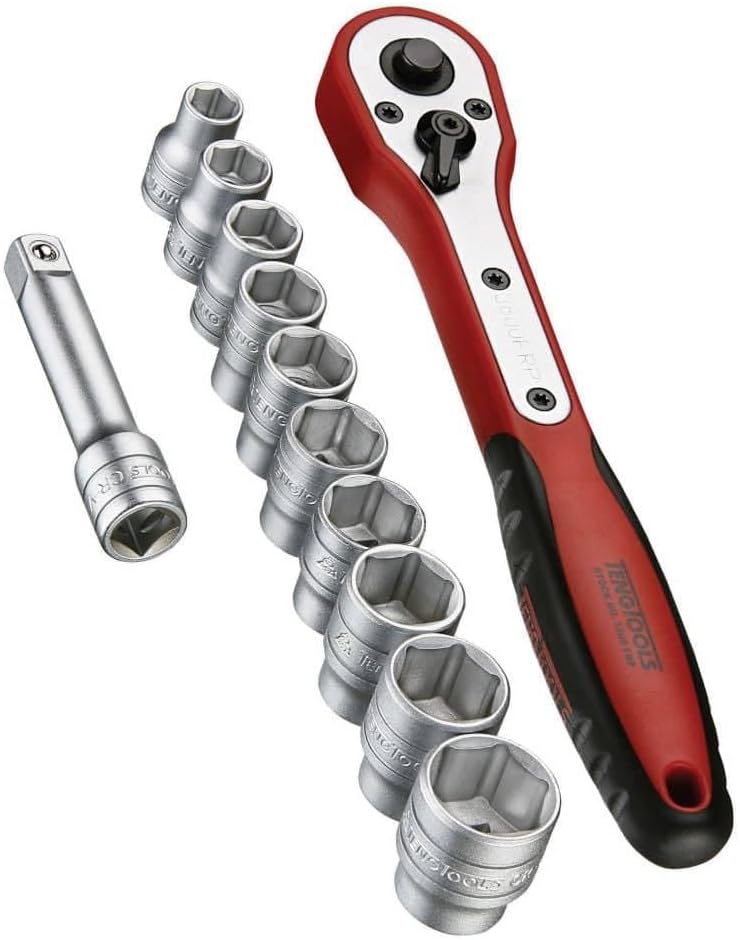 12 piece 3/8 inch drive socket set with an FRP (fibre reinforced) ratchet and an 3 inch extension bar.Sizes 8, 10, 11, 12, 13, 14, 15, 16, 17, 19mm.The set is supplied in a clip box which stores the sockets and includes a clip rail facility for adding extra sockets..Handy set that fits in the pocket.Accessories - 3/8 inch drive - FRP ratchet, 3in. extension bar.) 10 x Hex sockets: 8, 10, 11, 12, 13, 14, 15, 16, 17 and 19mm. 1 x 3/8in Drive ratchet handle with 45 teeth. 1 x extension bar: 75mm.