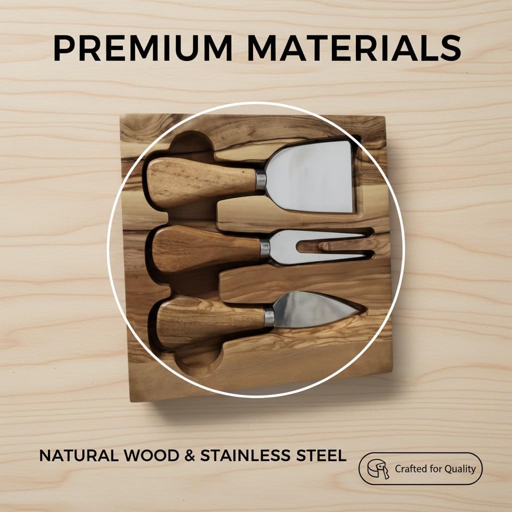 Unleash the full spectrum of cheese delights with our exquisite Piece Olive Wood Cheese Knife Set. Featuring two cheese knives, a serving fork and a cheese board with cut-outs for easy storage, it's a handsome addition to any table. Crafted from premium olive wood and stainless steel, each knife is designed to elevate your cheese presentation to new heights. The thin knife ensures precision cutting, while the pronged knife effortlessly picks up soft cheeses. The heart knife add a delightful touch to your platter. Complete your cheese-serving setup with the optional olive wood holder, offering a stylish and organized display. Personalize your set with for a unique and thoughtful gift. Whether you’re a cheese enthusiast or seeking the perfect culinary gift, our 3-Piece Olive Wood Cheese Knife Set promises a blend of functionality and elegance for an unparalleled cheese experience.