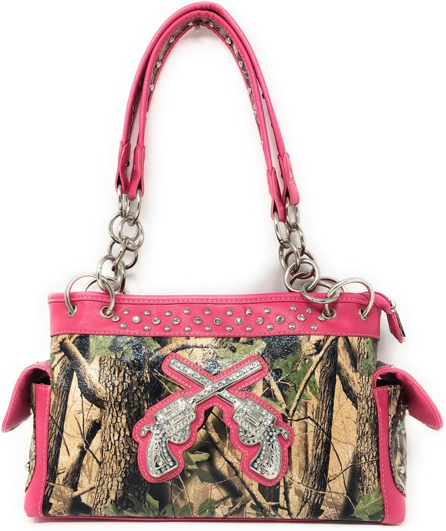This Western-style camouflage cross-body handbag combines style with functionality. The spacious 13" x 8" x 5" design features multiple compartments including a concealed back pocket, side magnetic snap pockets, and interior organization for your essentials. The handbag includes two zip pockets, two pouch pockets, a dedicated phone holder, and a back zipper closure pocket. Crafted with carved leather details and adorned with horse-themed accents, this messenger bag showcases a distinctive animal print pattern. The matching wallet comes equipped with 10 credit card slots, 2 ID slots, 3 bill compartments, and a checkbook holder. The cotton-lined interior provides durability while maintaining the bag's structure. Perfect for daily use, this versatile accessory weighs approximately 2.5 lbs and features a secure top zip closure. The chain strap design adds an elegant touch to this practical women's handbag that seamlessly blends Western charm with modern utility.