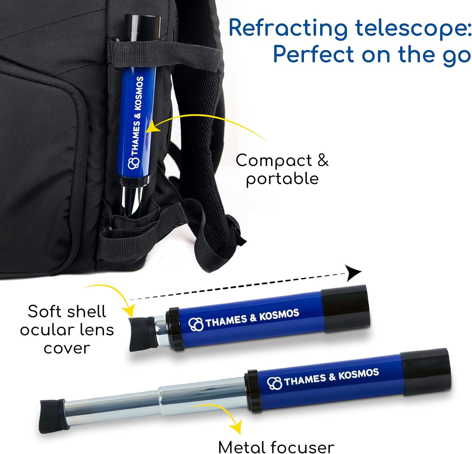 This entry level telescope has 12x optical magnification and a soft shell ocular lens cover (eye piece) for greater comfort. Young researchers are able to view the stars at night, watch wildlife, or become seagoing pirates. As with all Thames and Kosmos products, the high quality product ensures the scientific fun factor remains intact.