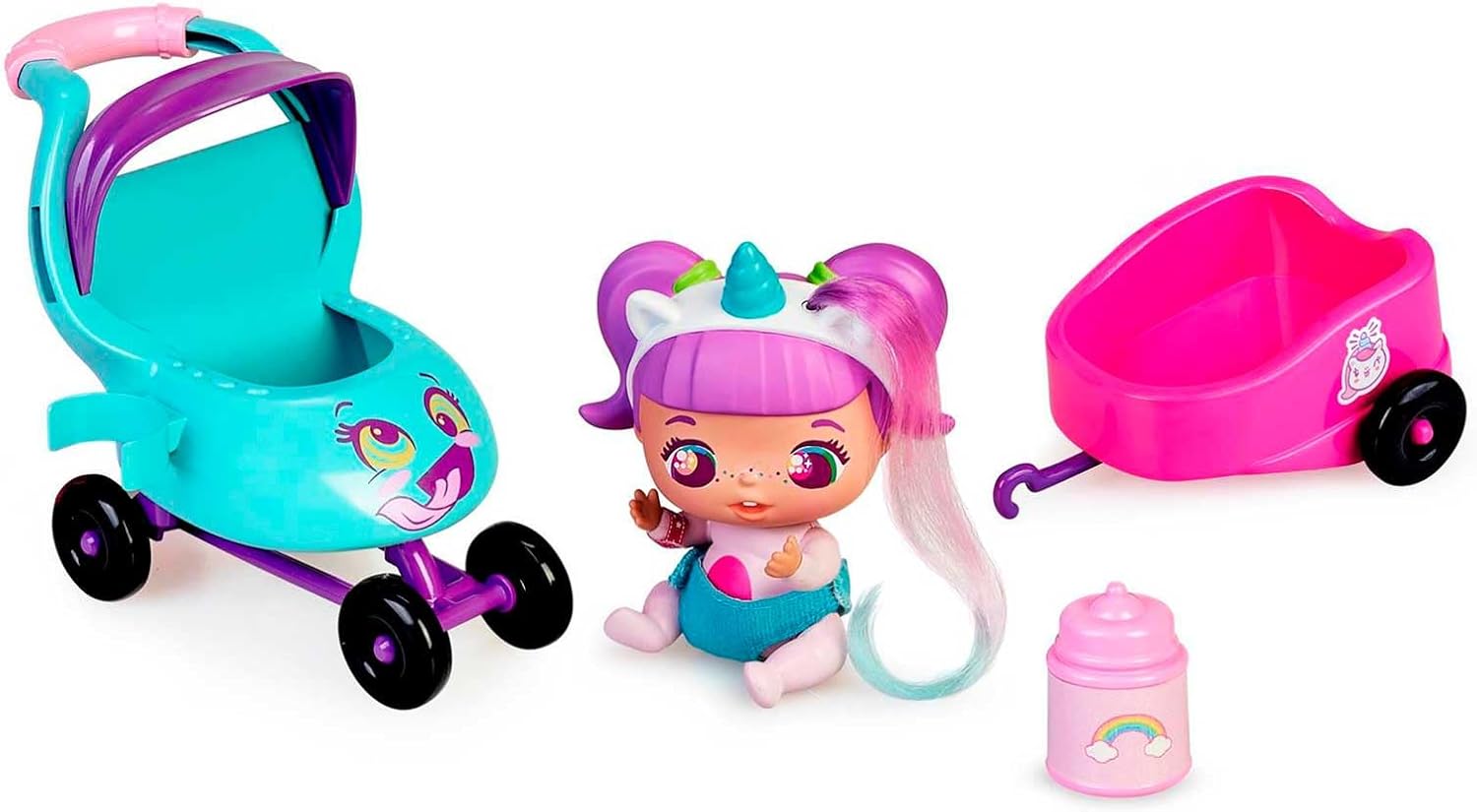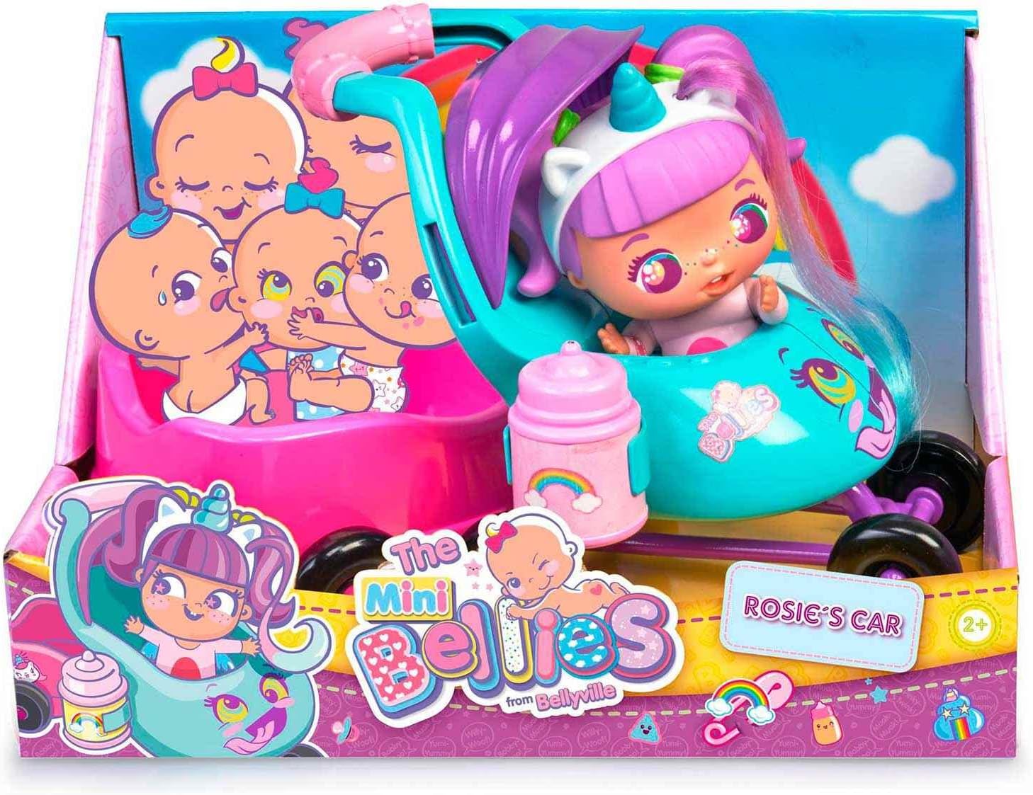 The Mini Bellies are the mischievous brothers of the Bellies. On this occasion, we have the new cart for 3 Mini Bellies with Rosie Rainbow included. The first transport for your mini Bellies. Includes different fun stickers to personalize the stroller and a bottle to play!