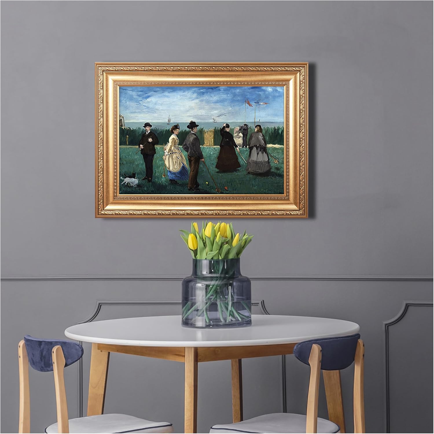 "The Croquet Party" (La partie de croquet) is a painting by Édouard Manet, completed in 1871. It depicts a lively outdoor scene where a group of elegantly dressed figures is engaged in a game of croquet in a garden setting. The painting captures a moment of leisure and social interaction, with Manet's characteristic attention to light, color, and composition. The scene is infused with a sense of spontaneity and movement, reflecting Manet's interest in capturing modern life and social gatherings with a touch of realism and charm.