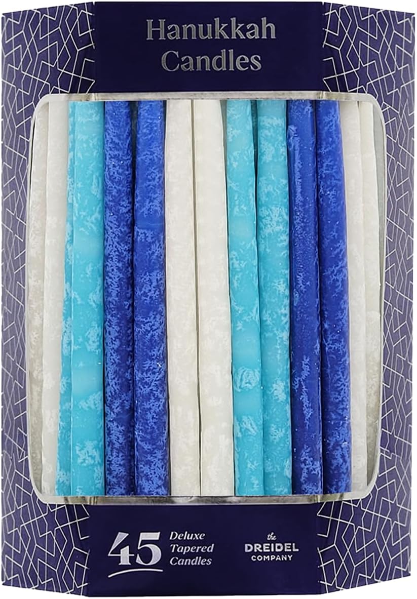 Chanukah Candles 45 Hanukkah Candles Decorative Multi Colored Purple, Blue, Orange Orange Stripes - Hand Made in Israel MULTI-COLORED DECORATED: These classic candles will really brighten your Hanukkah experience. Purple, blue, orange with orange stripes. STANDARD SIZE AND QUANTITY: These 5/16” diameter standard size candles perfectly fit any menora. Our 45 count box lasts through all 8 nights of Hanukkah, including the shamash. CERTIFIED KOSHER: These candles meet all Jewish law requirements to be lit in a menorah, and are designed to burn for more than 30 minutes. BEST CHANUKAH PRESENT: A great Jewish and Judaica gift, these candles make the perfect chanukah gift for kids and adults, and they can be use all year long for all kinds of occasions and parties. PRODUCT FEATURES: Kosher & Meets All Halachic Requirements. Stays Lit At Least 30 Minutes Premium Quality Wax 5/16” Standard Size Fits Most Menorahs 45 Count per Box