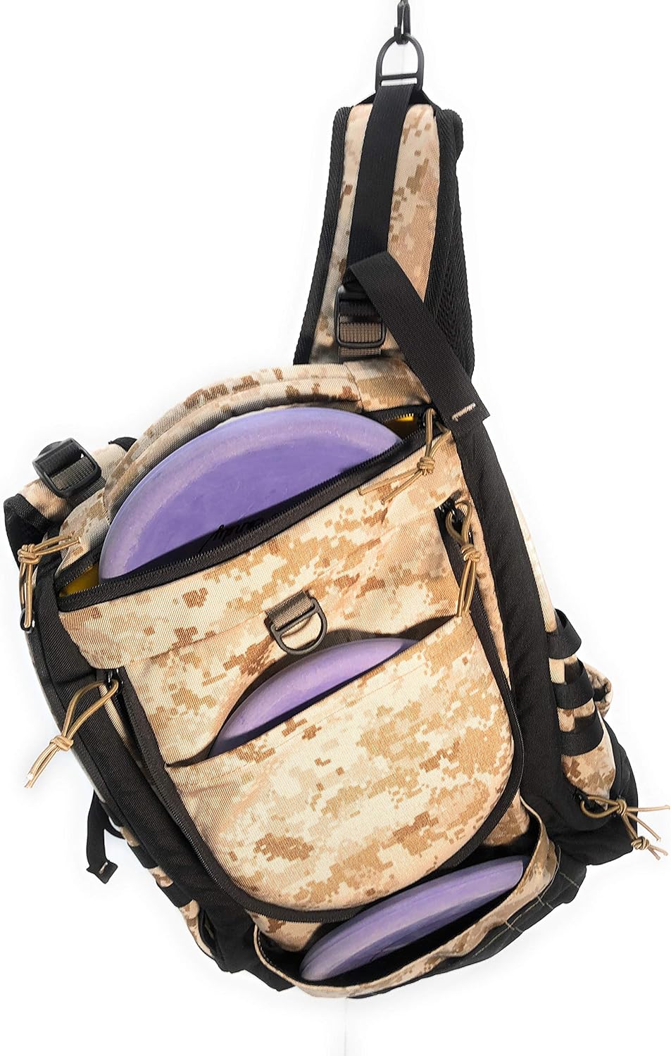 This Disc Golf Backpack is made from authentic 1000D Courdura Nylon and has many pockets to hold all your gear. Made in America from American made materials. The close cell foam padding, the YKK Zippers and the authentic Dupont Cordura nylon are all “Berry Compliant”materials. These domestic materials are usually reserved for military grade products but in an attempt to reintroduce American made goods to the sport we have painstakingly created this backpack to the highest standards here in the United States! Grab this backpack and hit the course, the top pouch is easily unzipped to hold your putter. This backpack has multiple Molly lash placements to tie off any of your other gear. It has a sturdy hand handle to be quickly grabbed and toted around play-by-play or thrown up over the shoulder straps and easily cinch down for long hikes to the next hole.