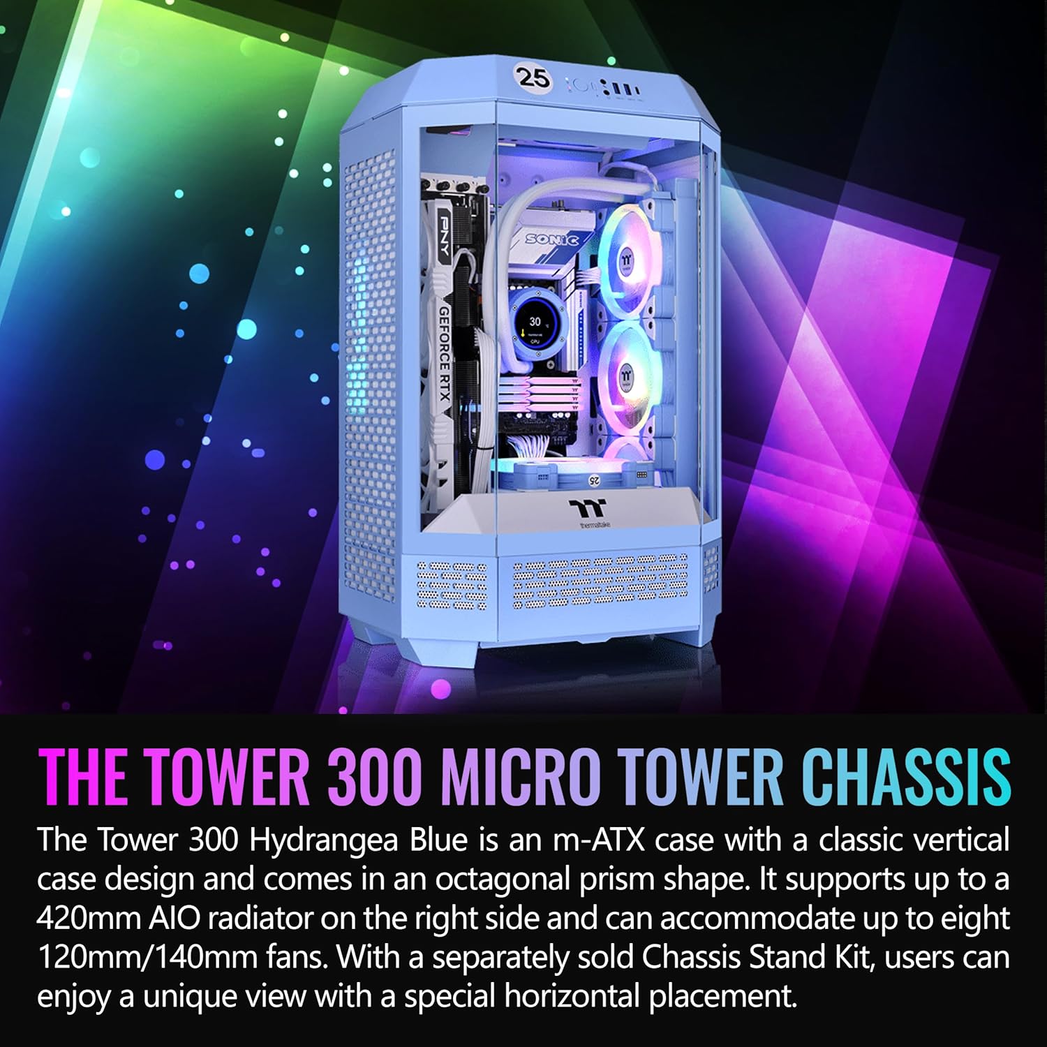 As a new edition of The Tower Series, The Tower 300 Hydrangea Blue inherits the classic vertical case design but comes in an octagonal prism shape. It has amazing hardware compatibility, accommodating a 4090 GPU, a standard-sized power supply up to 220mm, and a 420mm AIO radiator. What's more, it can accommodate up to eight 120mm/140mm fans on the top, back, PSU cover and right side fan bracket. If you want to make The Tower 300 Hydrangea Blue more visually appealing, you can purchase the separately sold 3.9" LCD Screen Kit and Chassis Stand Kit to upgrade the build; the former to display real-time component information and the latter for a unique view with a special horizontal placement. •P/N: CA-1Y4-00SFWN-00 •SERIES: The Tower •CASE TYPE: Micro Tower •DIMENSIONS: 551 x 342 x 281 mm (22.5 x 14 x 11.5 inch) •WEIGHT: 8.3 kg / 18.3 lbs. •SIDE PANEL: 3mm Tempered Glass x 1 •COLOR: Hydrangea Blue •MATERIAL: SPCC •COOLING SYSTEM: Top(exhaust):140 x 140 x 25 mm CT140 fan (1500rpm •EXPANSION SLOTS: 4 •MOTHERBOARD: 6.7" x 6.7" (Mini ITX) •I/O PORT: USB 3.2 (Gen 2) Type-C x 1 •PSU: Standard PS2 PSU (optional) •FAN SUPPORT: Top: 2 x 120mm, 1 x 120mm, 2 x 140mm, 1 x 140mm ; Right Side: 3 x 120mm, 2 x 120mm, 1 x 120mm, 3 x 140mm, 2 x 140mm, 1 x 140mm ; Rear: 2 x 120mm, 1 x 120mm, 2 x 140mm, 1 x 140mm ; Power Cover: 1 x 120mm, 1 x 140mm •RADIATOR SUPPORT: Right Side(AIO): 1 x 360mm, 1 x 240mm, 1 x 120mm, 1 x 420mm, 1 x 280mm, 1 x 140mm •CLEARANCE: CPU cooler height limitation: 210mm ; VGA length limitation: 280mm(With power cover), 400mm(Without power cover) ; PSU length limitation: 220mm