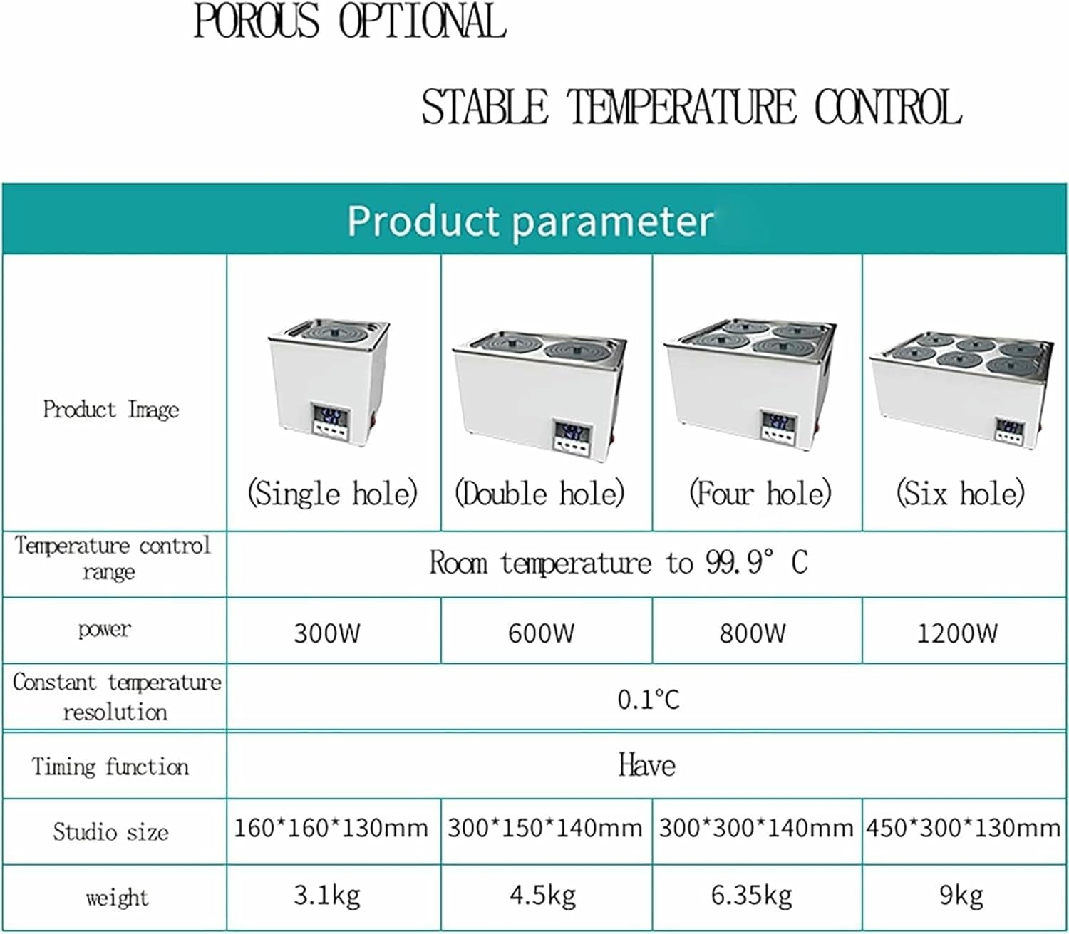 Characteristics:Digital temperature visualization and controlThe screen shows the real temperature and adjustment point.The temperature is controlled by an PID controller.It also has a timing function.304 stainless steel cavityThe unique molding process, without interface and without welding joints, can prevent oxide and corrosion.Distilled water is recommended on this device.SpecsName: Smart temperature water bathSingle hole:Power: 300WInternal size (mm): 160*160*130Double hole:Power: 600WInternal size (mm): 300* 150* 140Four holes:Power: 800WInternal size (mm): 300*300*140Six holes:Power: 1200WInterior size (mm): 450*300*130Temperature range: Ambient temperature ~ 99.9 (℃)Temperature fluctuation: 0.1 (℃)Temperature Control Method: Electric heatingVoltage: 220 v/60 HzInner wall material: 304 stainless steelScope: Medical Scientific Research, Chemical BiologyPackage Included:1*Adjustable ring cover1*Instructions1*Waterproof support1*Power cable