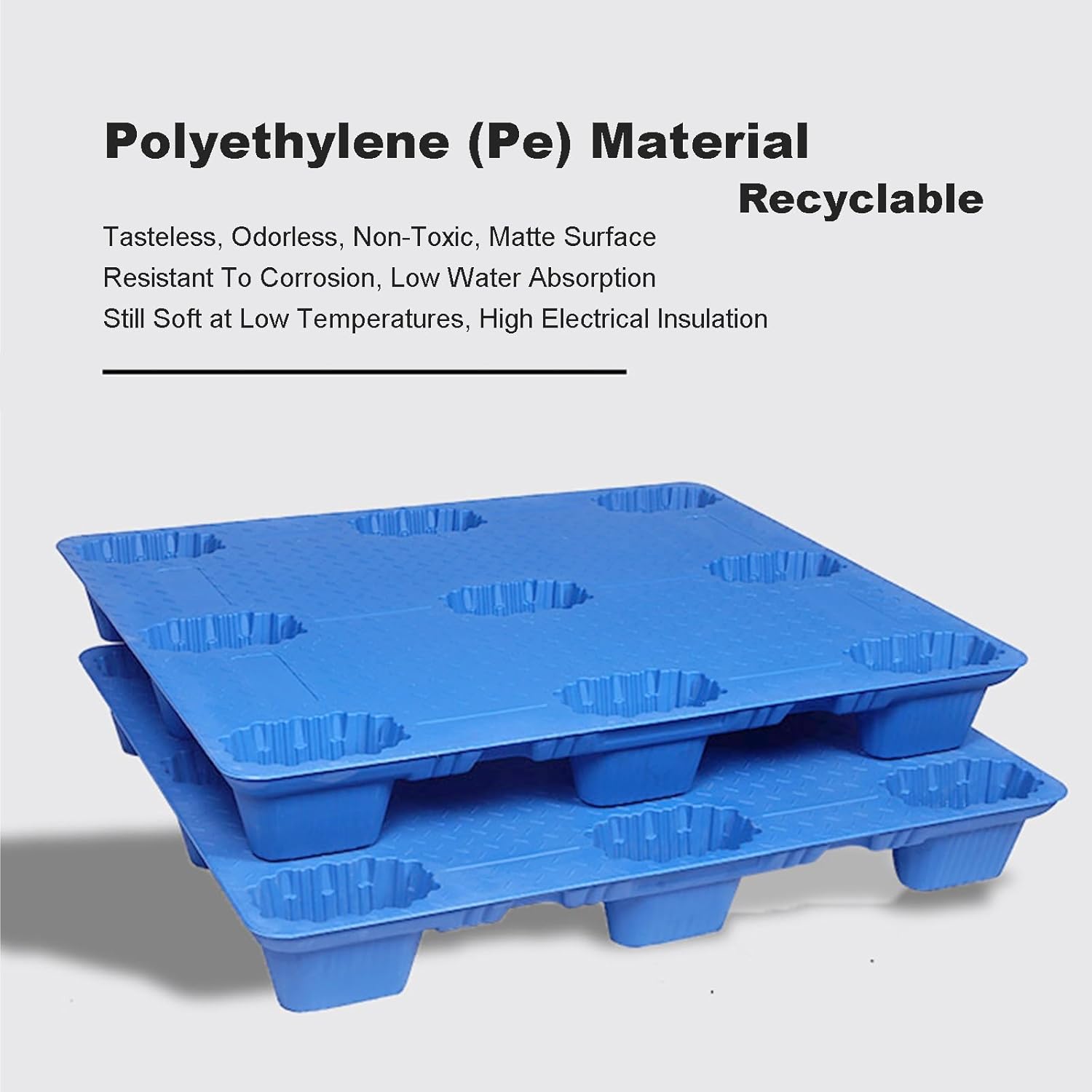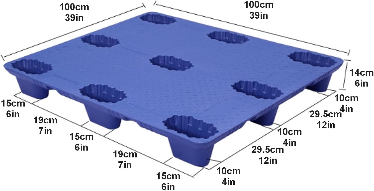 ●【Product Description】- PE material, light and durable- Bottom reinforcement ribs, stable and high load-bearing capacity- Grid design, ventilation and moisture-proof- Anti-skid pad to prevent slipping●【Specifications】- Material: PE- Color: Blue- Load-bearing: static load 2000-5000 kg, dynamic load 500-1500 kg- Size: 100x80x14cm/39x31x6in, 100x100x14cm/39x39x6in, 110x90x14cm/43x35x6in, 110x110x14cm/43x43x6in, 120x80x14cm/47x31x6in, 120x90x14cm/47x35x6in, 120x100x14cm/47x39x6in, 120x120x14cm/47x47x6in, 130x110x14cm/51x43x6in, 140x120x14cm/55x47x6in- Applicable scenarios: supermarkets, pharmacies, gas stations, basements, warehouses, residences, docks, cabins●【Included】- 1× plastic pallet●【Note】- Manual measurement, there may be slight errors in size.- Due to different screen displays, the color may be slightly different.