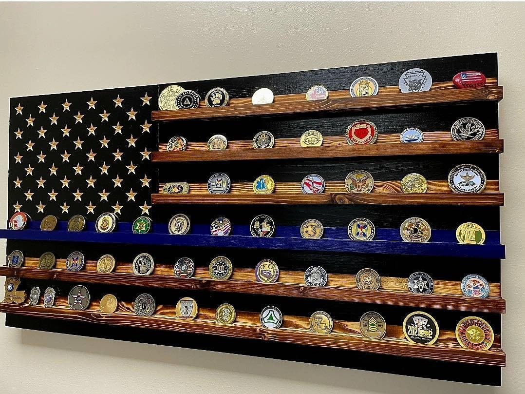 Proudly display your challenge coins that you have received from those who have recognized your excellence. Take pride in both your coin collection and patriotism by hanging a high quality, handmade wooden flag on the wall that displays both with exceptional style. Whether you're active military, veteran, member of law enforcement or first responder, it's important that where you stand doesn't go unnoticed. You'll love having it in your office, home, or anywhere else you want to remind people what you represent and stand for. Display your collection of challenge coins with a beautiful piece handmade in Texas! Please know that all pieces are made to order and the shipping timeframe reflects the current lead time with outstanding orders. Please send a message with any questions. Check out our full store for many more options!