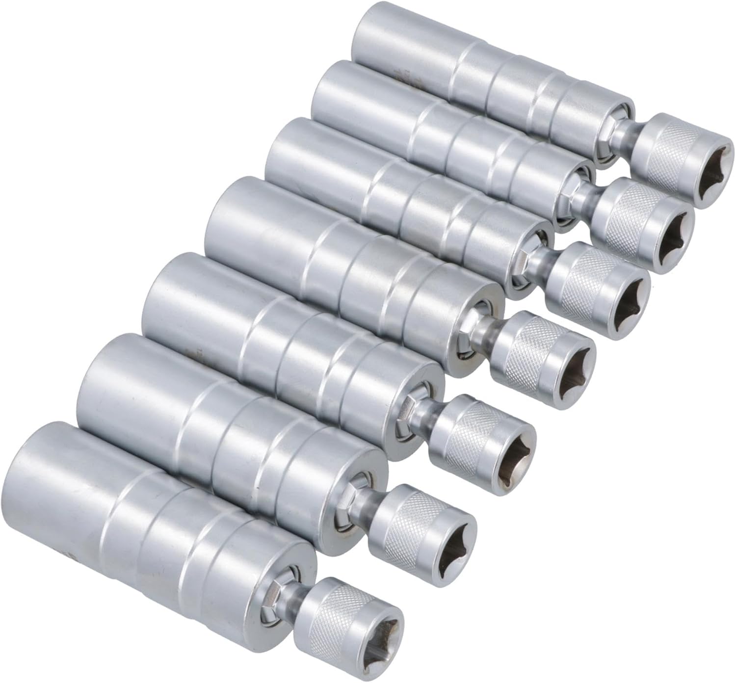 Professional spark plug sockets for commercial or occasional use Thin walled magnetic spark plug sockets 7pc spark plug socket Swivel socket for access in restricted hard to reach areas (maximum flexibility) Metric and imperial spark plug sockets 3/8in drive so will fit any 3/8in drive ratchet, power bar, extensions etc... Magnetic core to retain the removed plug Thin walled design reduces the outside diameter of the socket ensuring that it fits into the spark plug aperture Manufactured from CR-v steel for maximum strength and durability 12 sided point / Bi-hex sockets Magnetic core to retain the removed plug Knurled grip around the socket to prevent slipping in oily slippy conditions Comes in a blow molded case for easy storage and transportation SET INCLUDES THE FOLLOWING SIZES 14mm, 9/16in, 16mm, 18mm, 3/4in, 13/16in and 21mm SPECIFICATIONS Spark plug sockets Swivel sockets Thin walled socket Material – CR-v steel Finish – satin finish Drive size – 3/8in. Total length – 100mm Magnetic core 12 point / Bi-hex sockets Blow molded case