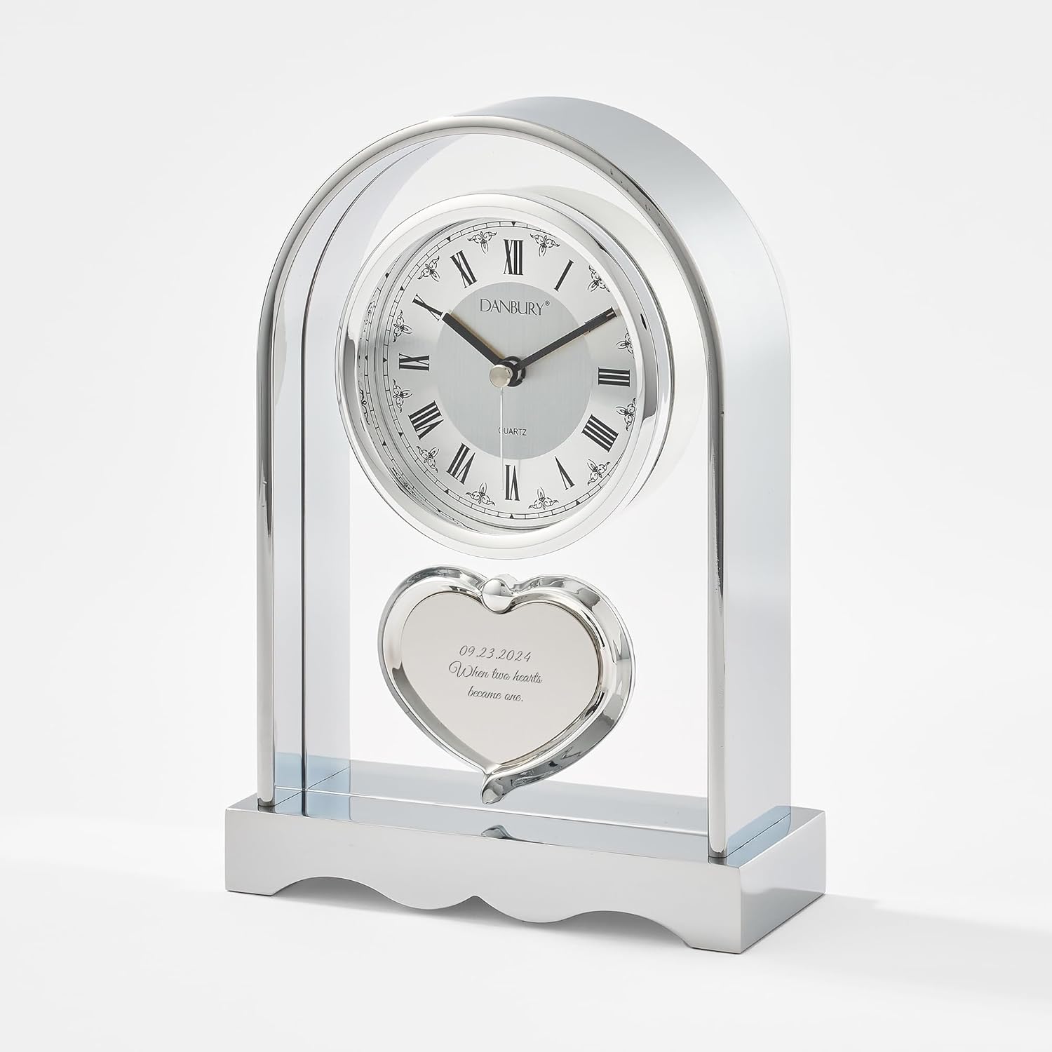 Celebrate a timeless love with this Things Remembered Personalized Couple’s Heart Mantel Clock. The large dome-shaped clock features a roman numeral face, quartz movement and an aluminum border detail. Engrave at no additional cost the heart plate in the center of the clock with a couple’s name and wedding date, a special message or simply a family surname.Size: 7.5" H x 5" W x 1.75" D Material: Aluminum and Non-Alarm China Movement Battery: Requires 1 AA Battery, NOT included
