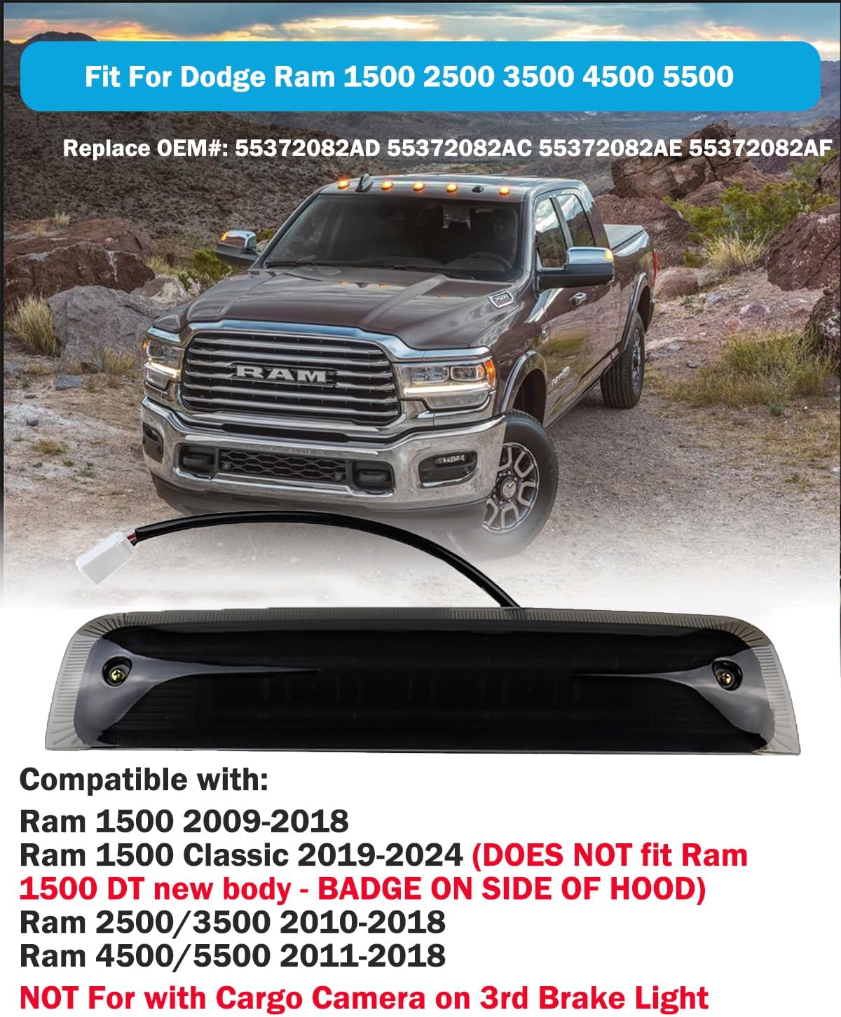 Our LED third brake light is a quick and easy way to dress up your pickup truck. When lit, the bright LEDs (Light Emitting Diodes) are illuminated, and shine up to ten times brighter than standard light bulbs. Even when the brake is not pressed, the integrated cargo light gives off plenty of white light to view your gear in the truck bed. Features: Built In Super Bright Cargo Light Function. Plug-n-Play Operation,Low Power Consumption. Super Bright LED lights Compare to the OEM Halogen. Durability: Professional housing design with heat sink at the back of the lamp ensures LEDs not over heated and have longer life span. Waterproof: With reverse polarity protection and open circuit protection, 100% waterproof and shock resistant. Superior Material: ABS High quality Plastic / Polycarbonate Lens / 3D LED special design. Specifications: Light Color:Red+White Lens Color:clear Reflector Color:Black Housing Color:Black Bulb Type:LED LED Function:Brake,Cargo Material:ABS Plastic,Polycarbonate Lens Placement on Vehicle:Rear Fitment Type:Direct Replacement Manufacturer Part Number:55372082AD Interchange Part Number:55372082AC Other Part Number:55372082AE,55372082AF Please Note: Highly recommended to use hand tools for installation. Power tools can easily over tighten and crack the light. DESIGNED TO FIT for 2009-2018 Dodge RAM 1500 for 2019-2024 Dodge RAM 1500 Classic (The "RAM 1500" badge is on the door not hood side) for 2010-2018 Dodge RAM 2500 3500 4500 5500 Package Include: 1 x Ram 3rd Brake Light