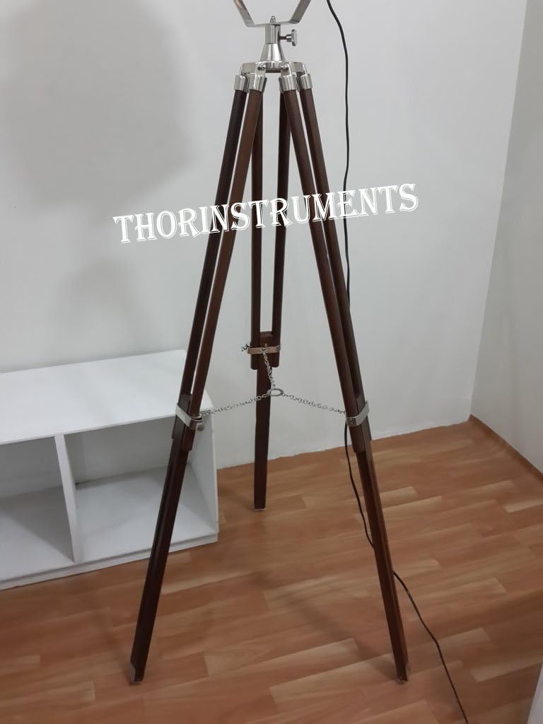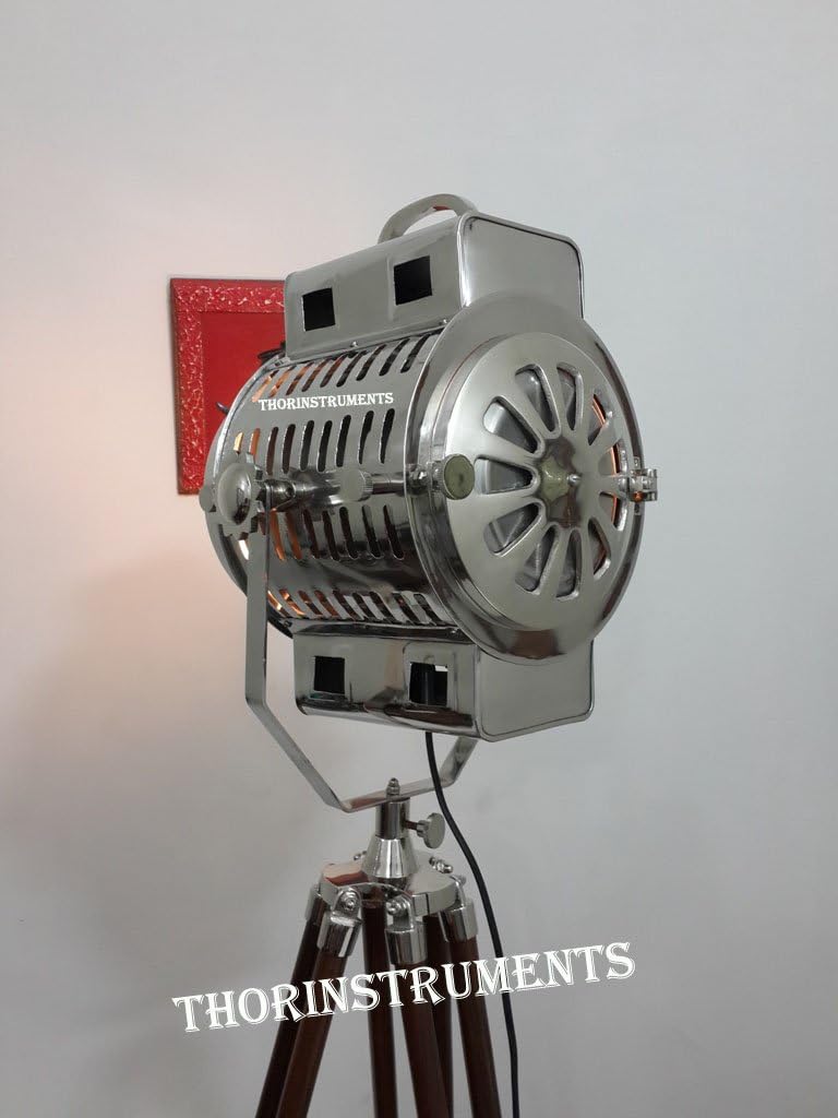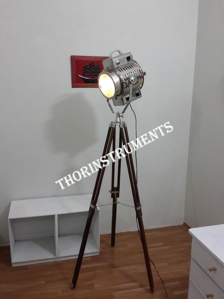 Vintage Chrome Spot Light Brown Wood Tripod Stand Materiel: Aluminum/Steel & Wood FRONT DIAMETER: 8" DEPTH: 10" FULL HEIGHT: 70" INCHES Color: Chrome & Brown