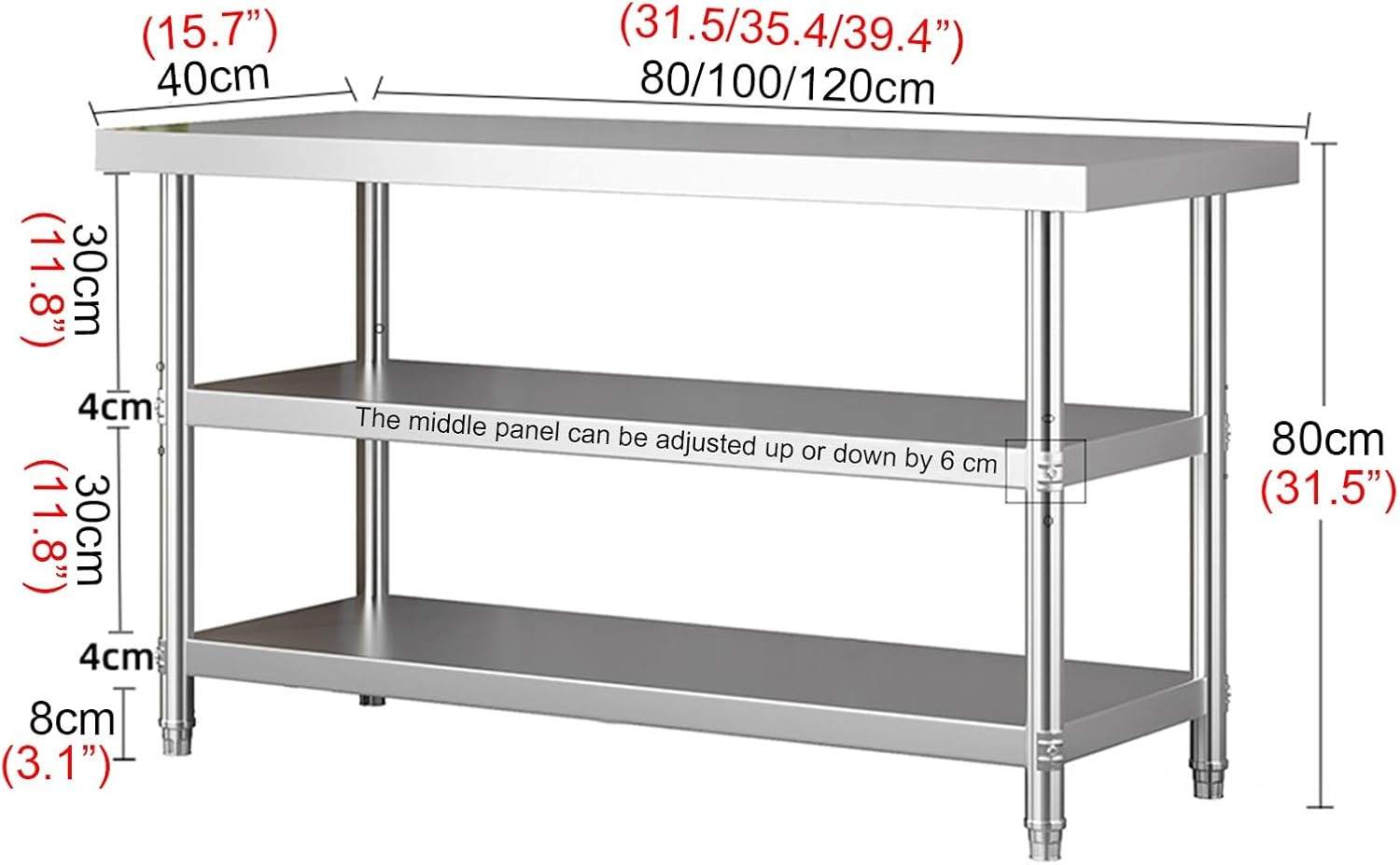 Product Name: Multifunctional Workbench Storage RackMaterial: Stainless SteelDimensions:80x40x80cm/31.5x15.7x31.5” , 100x40x80cm/39.4x15.7x31.5”, 120x40x80cm/47.2x15.7x31.5”, 60x50x80cm/23.6x19.7x31.5”, 70x50x80cm/27.6x19.7x31.5”, 80x50x80cm/31.5x19.7x31.5”, 90x50x80cm/35.4x19.7x31.5”, 100x50x80cm/39.4x19.7x31.5”, 110x50x80cm/43.3x19.7x31.5”, 120x50x80cm/47.2x19.7x31.5”, 70x60x80cm/27.6x23.6x31.5”, 80x60x80cm/31.5x23.6x31.5”, 90x60x80cm/35.4x23.6x31.5”, 100x60x80cm/39.4x23.6x31.5”, 110x60x80cm/43.3x23.6x31.5”, 120x60x80cm/47.2x23.6x31.5”Applications: Hotels/Kitchens/Restaurants/WorkshopsBrushed stainless steel finish for easy cleaning and rust resistance. Reinforced bottom crossbeam. Additional crossbeams under the tabletop provide multiple sturdy supports non-slip, wear-resistant legs with adjustable design. Adjustable feet ensure stability, scratch-resistant support.Product Contents: Workbench x 1 (excludes other items)Important Notes:Stainless steel products may exhibit slight weld marks due to manufacturing processes.Minor scratches may be present on stainless steel components.Dimensions are manually measured and may vary slightly.Images may show slight color differences due to photography angles, and resolution variations.