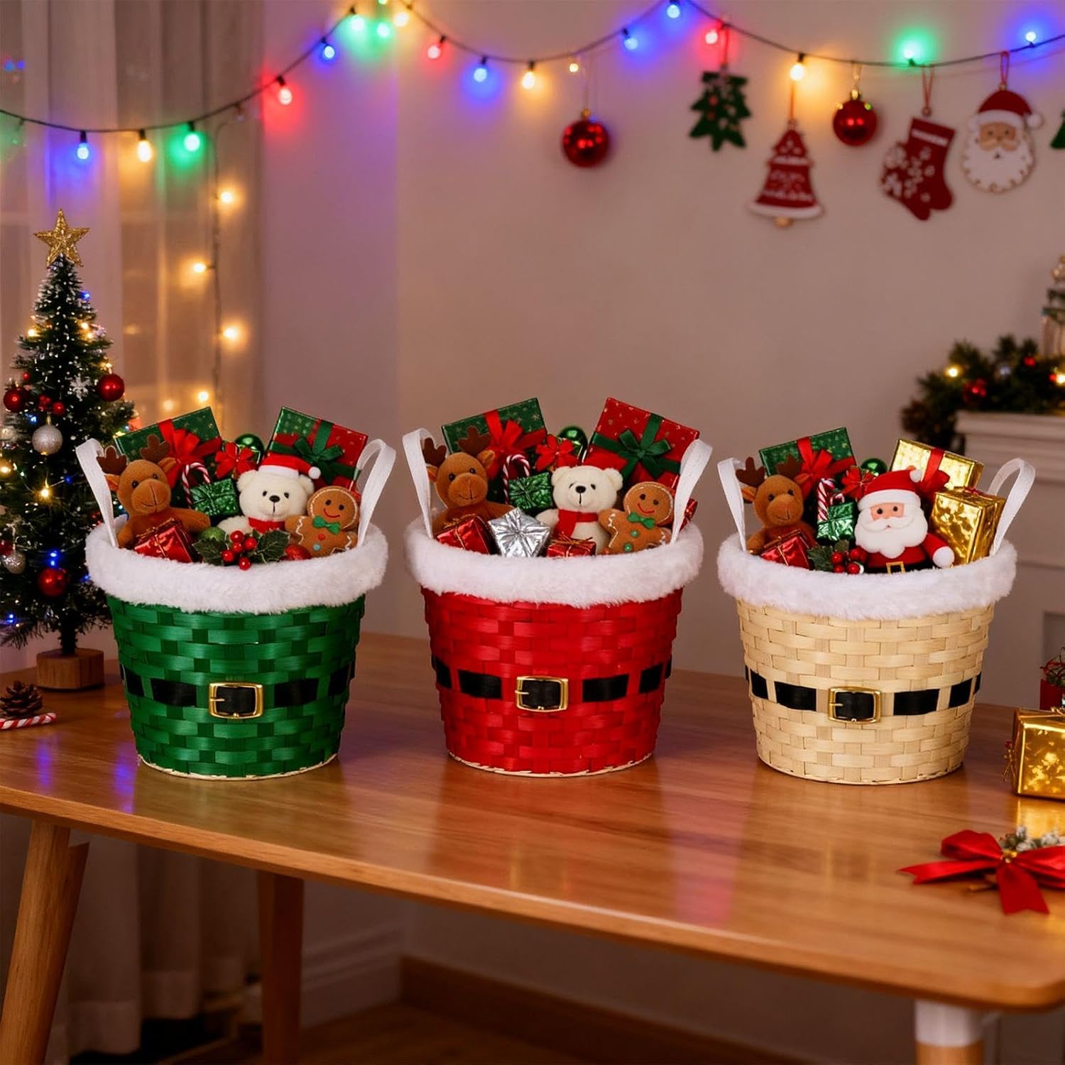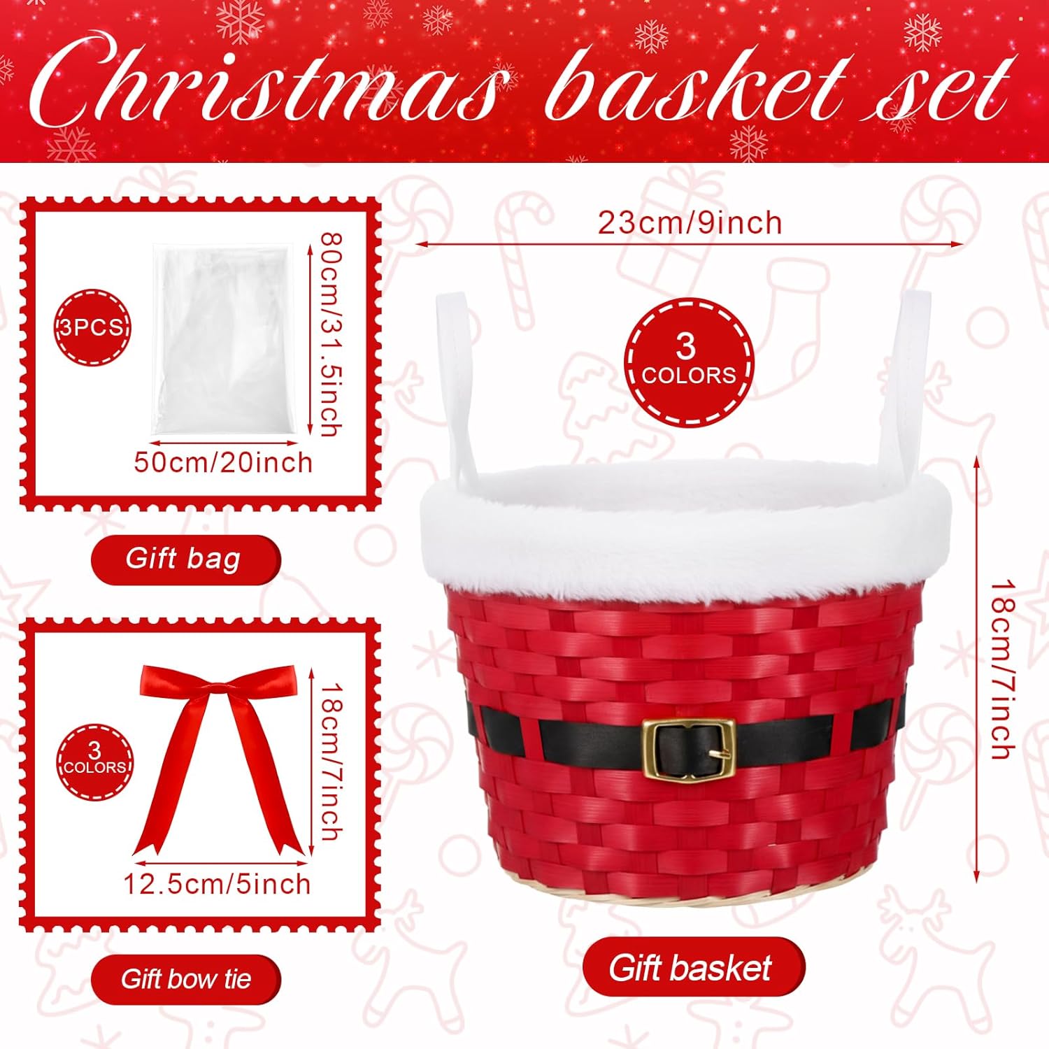 Features: This package includes a set of three Christmas baskets, offering value for your seasonal decor needs. Use them throughout your home to create consistent Christmas decorations, or share them as gifts to spread the festive cheer with a perfectly themed touch. These wicker Christmas baskets are easy to incorporate into any holiday decor. With their classic Christmas theme and vibrant color palette, they seamlessly blend with other Christmas decorations while adding their own appeal. Transform any space into a holiday wonderland effortlessly. Specifications: Material: bamboo woven Color: red, green, wood color Size: about 9 x 7 inch (diameter) Package includes: 3 x Basket 3 x Bags 3 x Bows Notes: Manual measurement, please allow slight errors on size. The color may exist a slight difference due to different screen displays