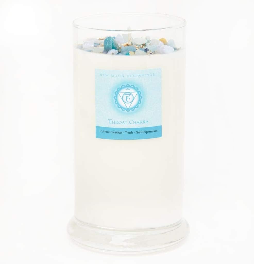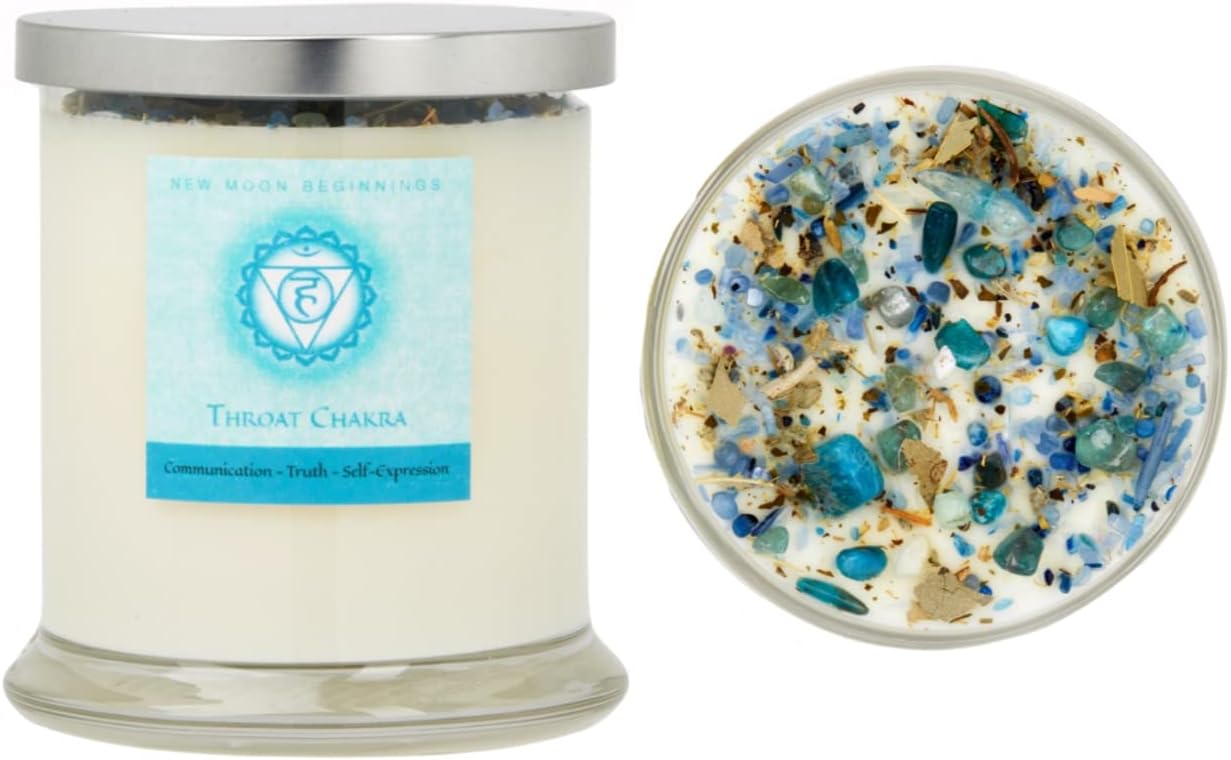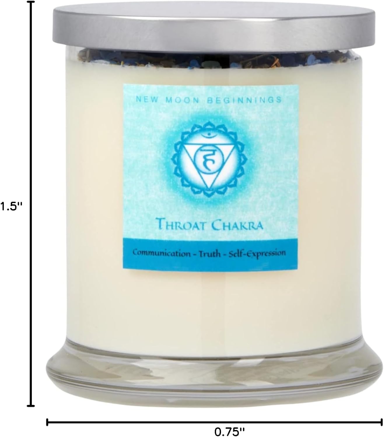 Our Throat Chakra Candle was created to promote Truth, Communication, and Self Expression. The Throat Chakra (The Visudda) is located at the base of the throat and neck. This chakra corresponds with personal expression and the ability to listen effectively and communicate clearly through speech and the written word. When the throat chakra is balanced, one has inner trust, inner reliance and easily expresses their ideas and thoughts. Blue has a calming effect that allows us to connect to higher thought processes and express them. The Throat Chakra Candle has a Minty, Herbal, Cool, and Fresh scent with Blue Apatite, Aquamarine, and Blue Kyanite healing crystals on top. Handmade and Hand-poured with Soy Wax for a Long, Clean Burn!This listing is for a single (1) New Moon Beginnings Candle container or pack of tealights. New Moon Beginnings Candles are Handmade and Hand-poured in the USA. We use 100% Natural Soy Wax, Essential oils, Natural Fragrance Oils, and 100% Cotton Wicks (Lead-Free). Each candle is topped with Genuine Crystals and Stones, flowers, and herbs which are all mindfully selected to help set the intention of the candle.Size Options include: Tealights in a set of 6: Each Tealight is .75" tall and 1.5" in diameter7.5 oz. Glass Jar: 3 inches high and ~2.75 inches in diameter8 oz. Tin with lid: 2 inches high and ~3 inches in diameter12 oz. Glass Jar with lid: 3.5 inches high and ~3.25 inches in diameter21 oz. Glass Jar with lid: 6.25 inches high and ~3 inches in diameterBURN TIMES: Tealights: 4 to 6 hours per tealight7.5 oz: 20 to 30 hours8 oz: 20 to 30 hours12 oz: 40 to 60 hours21 oz: 80 to 100 hours