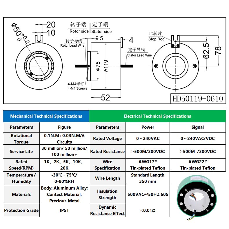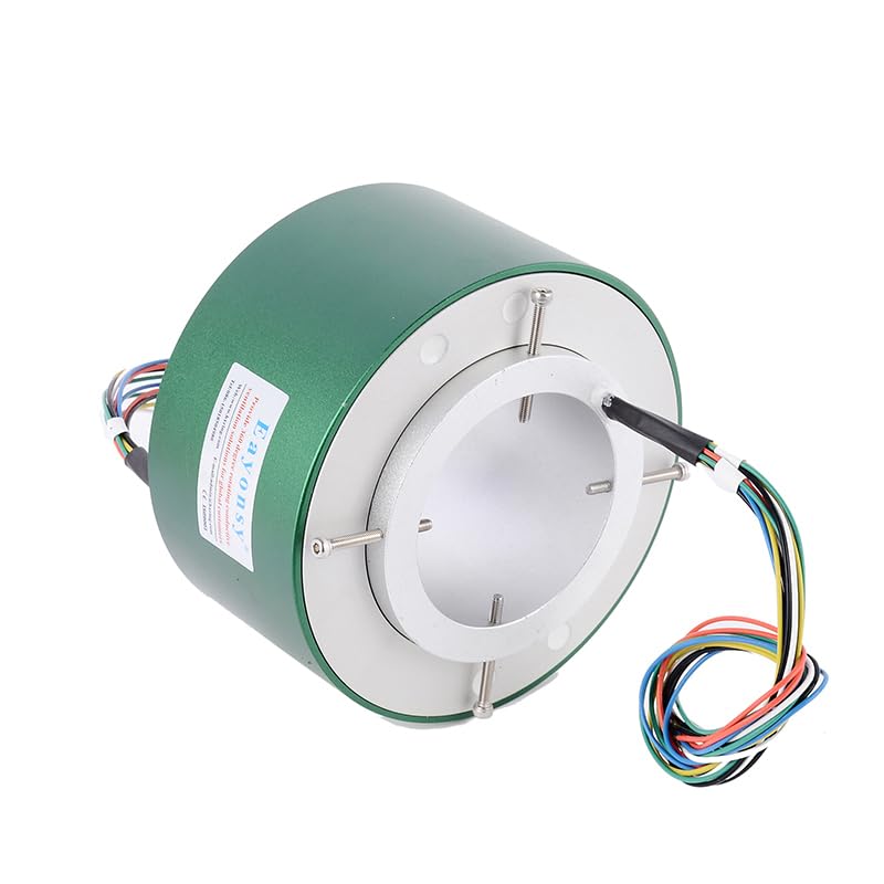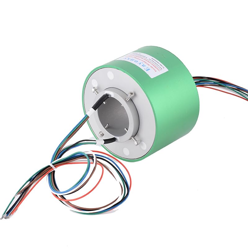 This through-bore conductive slip ring is made of durable aluminum alloy, available with a 50mm and 60mm inner bore. It allows smooth rotation while transferring power between stationary and rotating parts. Easy to install and maintenance-free, this slip ring provides long-lasting and reliable performance. Package includes: one conductive slip ring. Technical Specifications: 1. Inner bore: 50 mm or 60 mm 2. Outer diameter: 119mm or 130mm 3. Material: Aluminum alloy shaft and housing 4. Standard circuits: 6 wires / 12 wires (custom available) 5. Current rating: 10 A per circuit (standard; other ratings customizable) 6. Voltage rating: typically up to 550VAC/VDC (model dependent) 7. Contact type: brush / multi-point contact (industry standard) 8. Max speed & lifetime: industry: 0–500 rpm; millions of revolutions