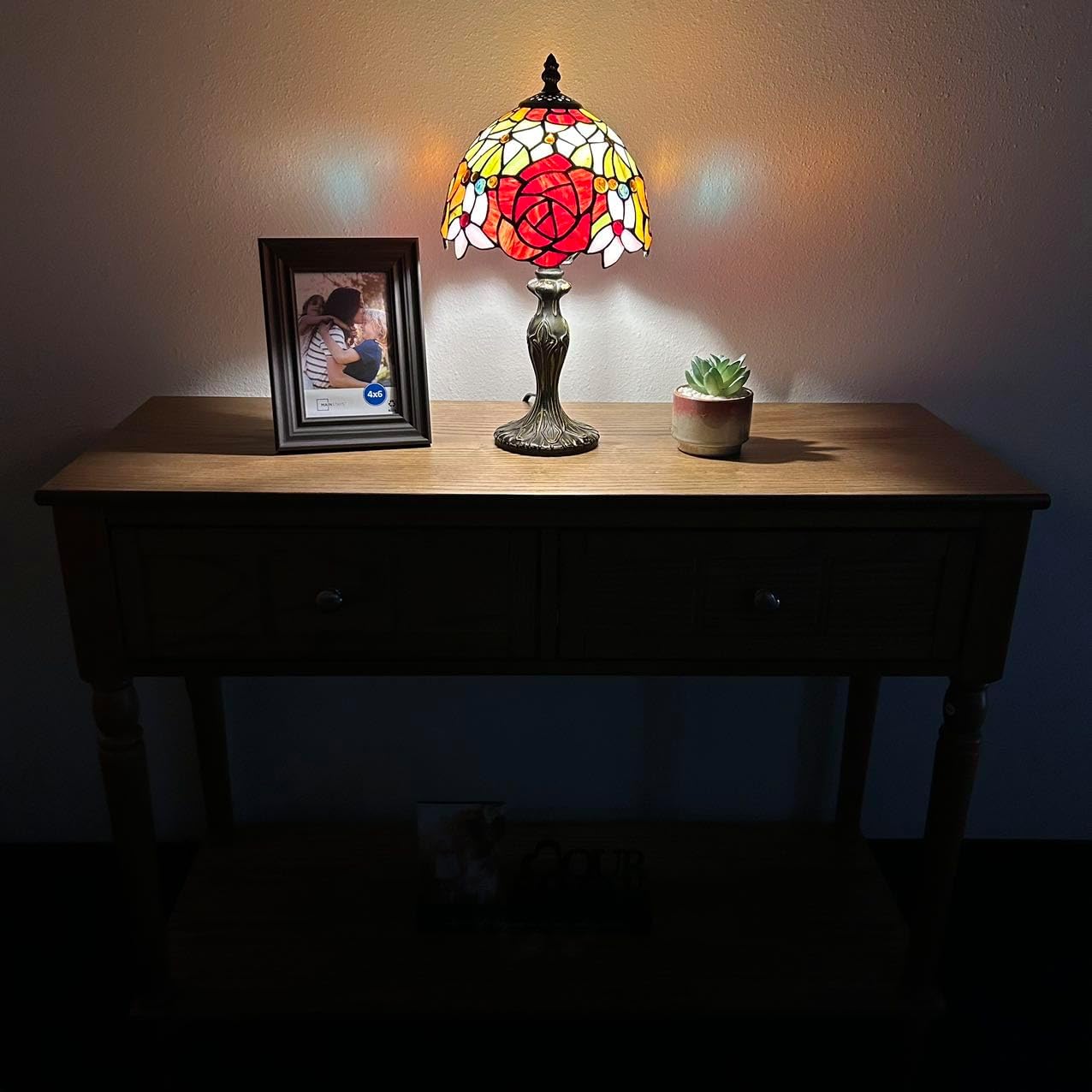 Zinc alloy base with bronze finish. bulb not included.. Each piece of stained glass is hand-soldered into place using the traditional copper foil technique.