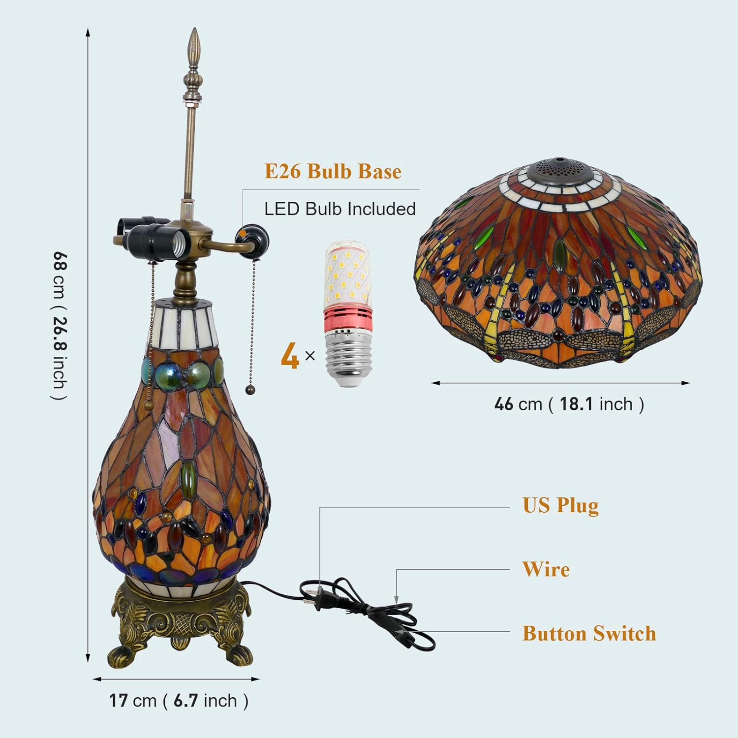 | Additional Features | Classic Style, Corded, Easy Assemble, Handmade Stained Glass Lamp Shade, LED Bulb Included |