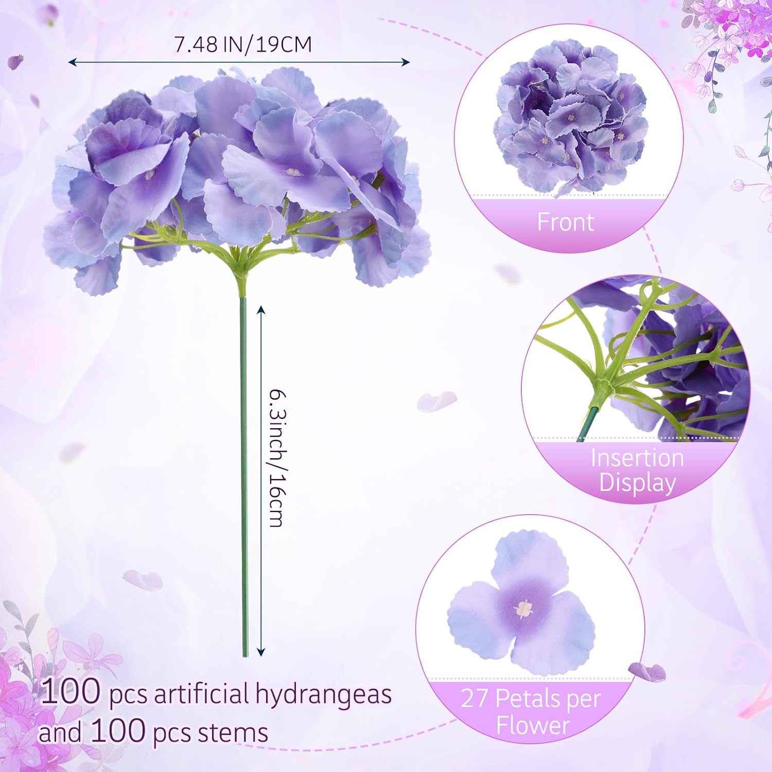 Features: Thoughtful gift: These realistic artificial flowers make an ideal gift for various occasions. With their elegant appearance and exquisite craftsmanship, you can use them to show your love, appreciation, or congratulations to your friends, family, or loved ones. Beautiful and realistic: Our artificial flowers for centerpieces are made with silky cloth material, which can mimic the natural appearance of real hydrangeas. With vibrant color options, these flowers can create a lifelike display. Specifications: Material: silky cloth Color: as shown in the picture Size: about 7.48 inches in head diameter, 3.6 inches in head height, 6.3 inches in stem length Package includes: 100 x Artificial hydrangea Notes: Manual measurement, please allow slight errors on size. The color may exist a slight difference due to different screen displays. Please note that the flower heads and the stems are separated, need to be manually installed