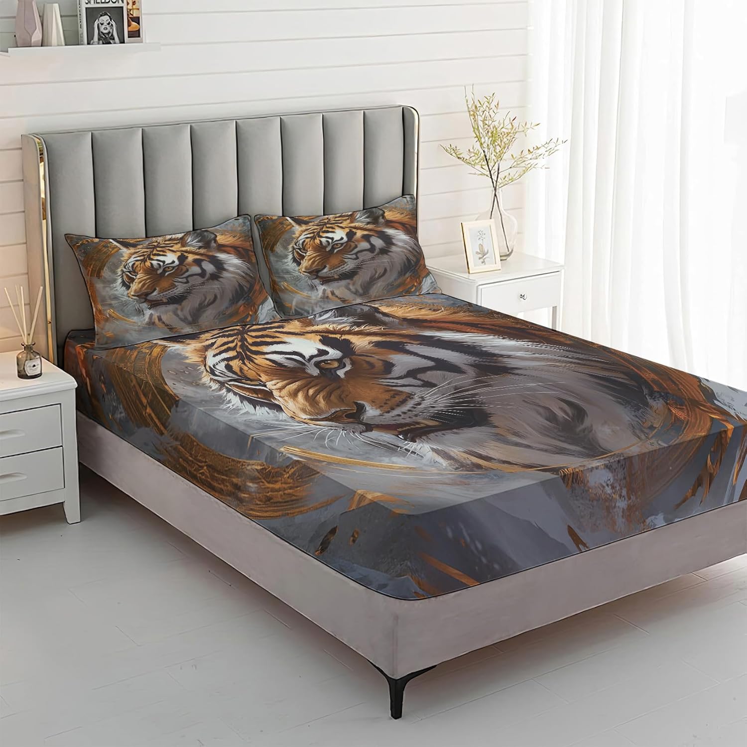 Tiger Sheets Queen Size, 3D Tigers Bed Sheets & Bedroom Decor, Wild Animal Bedding Set 4 Piece - 16 Inch Deep Pocket Fitted Sheet,1 Flat Sheet, 2 Pillowcases, Microfiber