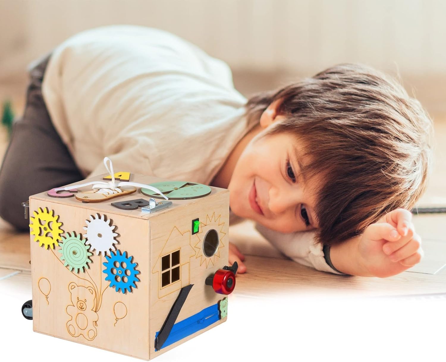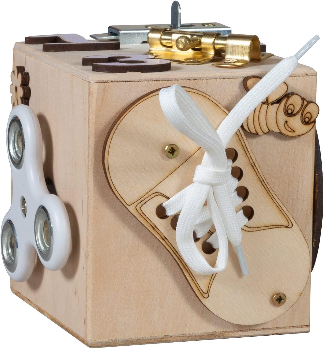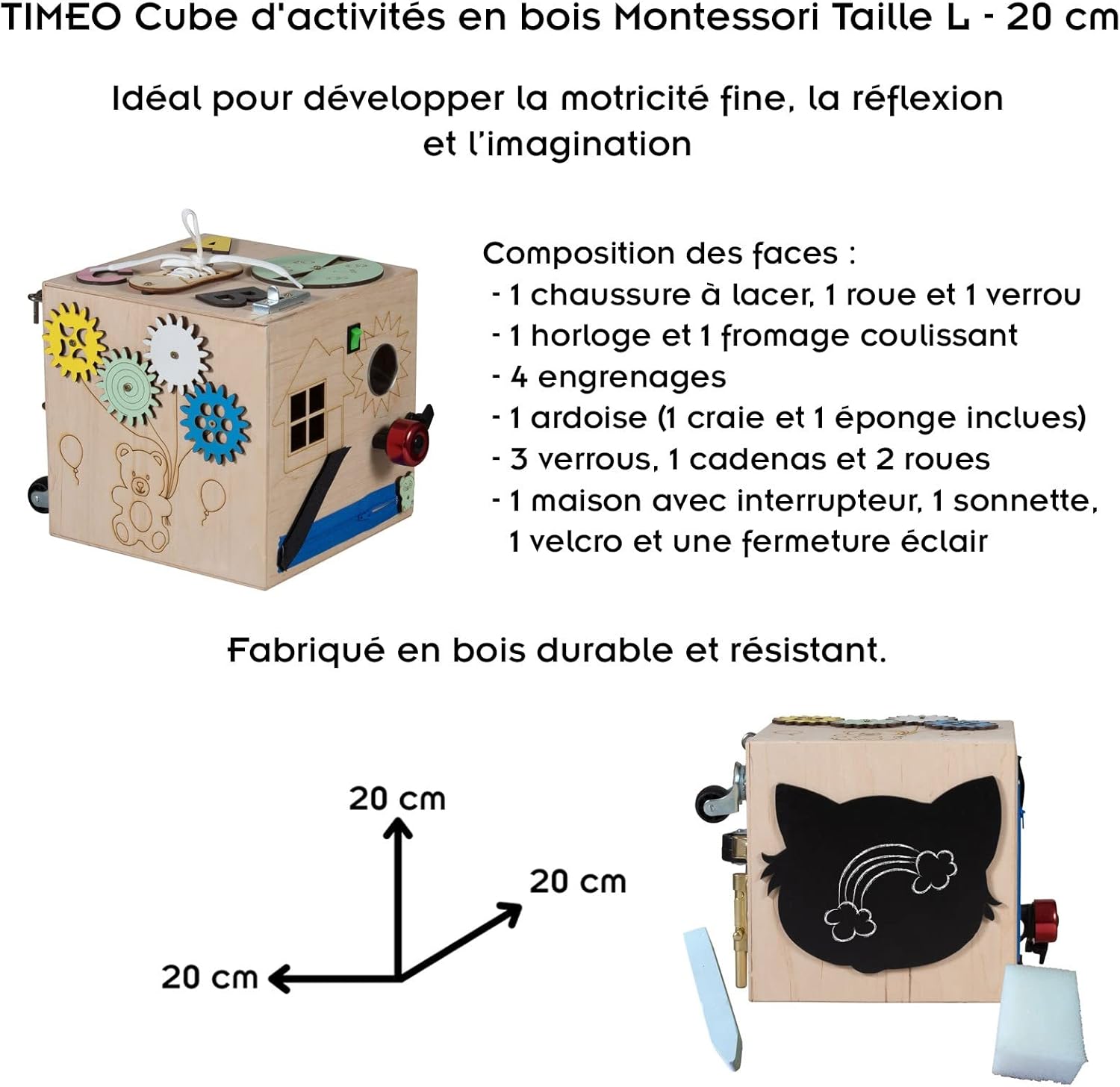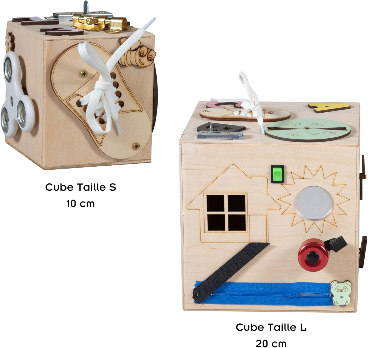TIMEO Montessori Wooden Activity Cube - Busy Motor Skills Cube. Suitable for ages 3 and up. Features: This Montessori cube is the perfect ally for your children! Through the different activities, they will be able to touch, try, attack, tie, imagine, close, open, again and again! Made of durable and resistant wood, your little ones will enjoy handling them safely. They will be able to develop their fine motor skills, their thinking and their imagination, while having fun! Technical features: Cube Size S: - 1 x Lace Up Shoe - 1 x handspinner - 2 gears - 1 x mirror - 2 locks and 3 digits - 1 wheel Cube Size L: - 1 lace-up shoe, 1 wheel and 1 lock - 1 clock and 1 sliding cheese - 4 gears - 1 Slate (1 chalk and 1 sponge included) - 3 locks, 1 padlock and 2 wheels - 1 house with switch, 1 doorbell, 1 velcro and a zipper Wooden cubes available in size S (10x10x10cm) and size L (20x20x20cm). NOTE: no delivery to the islands: Sicily, Sardinia, Elbe, Canary Islands, Ceuta and Melilla